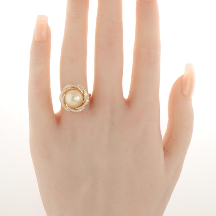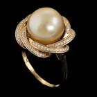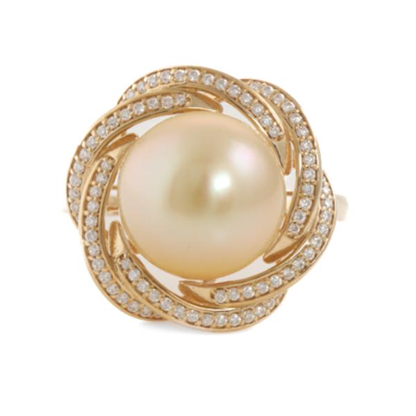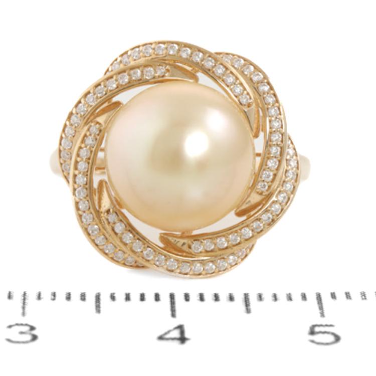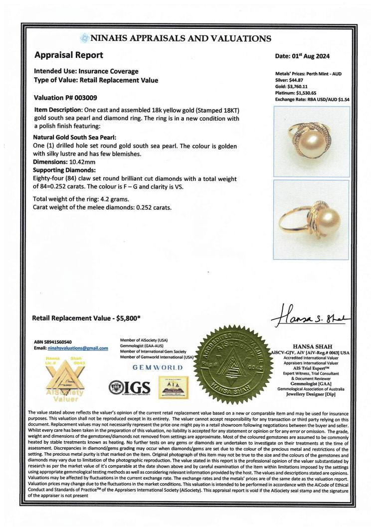Pearl and Diamond ring with centre Golden South Sea Pearl of 10.4mm and round Natural Diamonds totalling 0.25ct. 18ct yellow gold. Ring size N. Band width: 1.2mm-1.9mm. Weight: 4.2g. With Valuation Certificate dated 01/08/24. (Pre-owned)