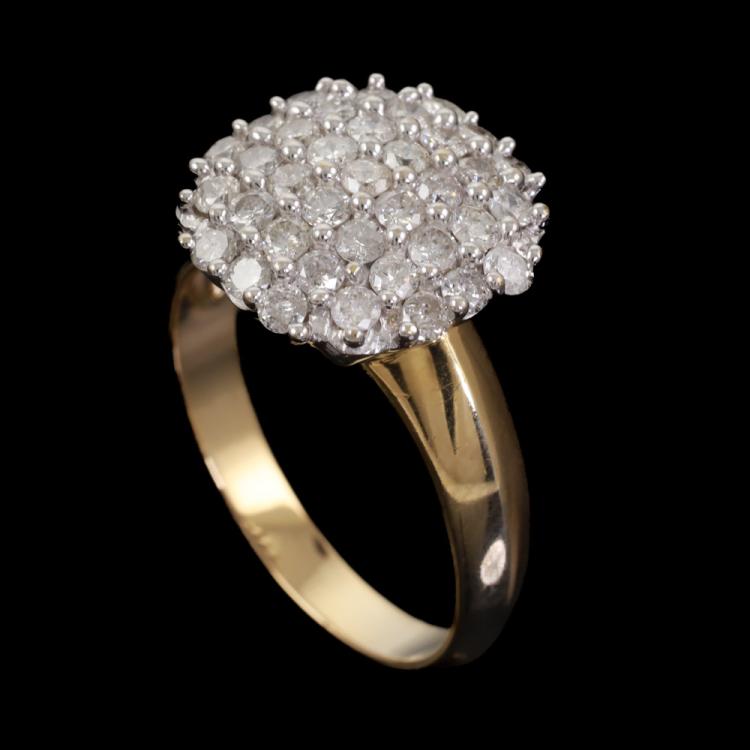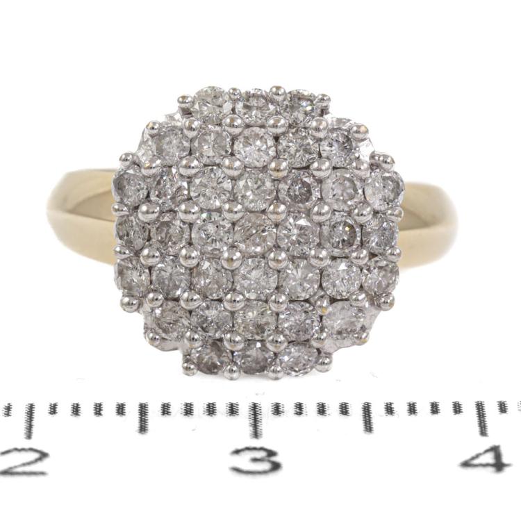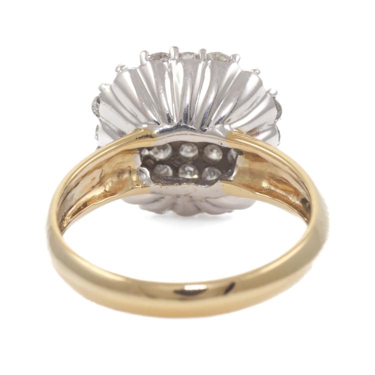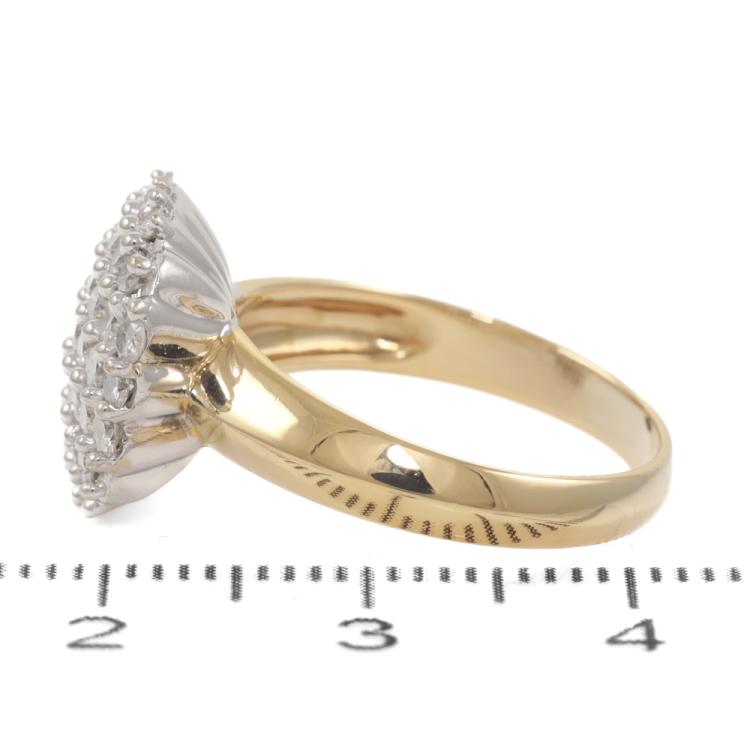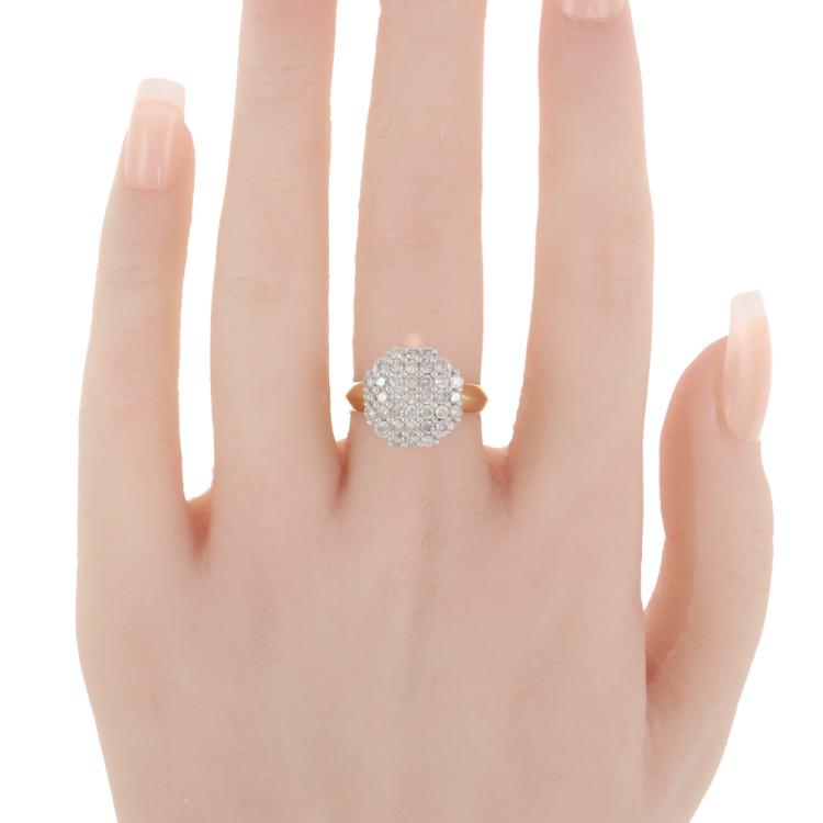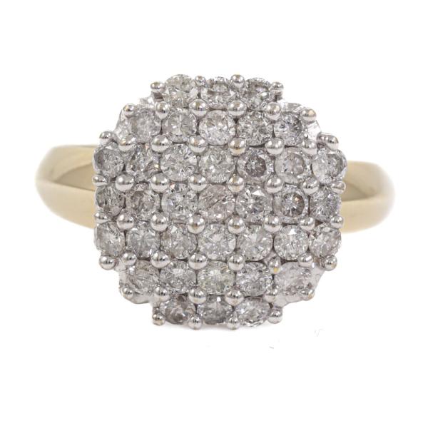 Diamond dress ring with pave set round Natural Diamonds totalling approximately 1.10ct (Estimated grading: H-I P1). 18ct yellow and white gold. Ring size M. Band width: 2.7mm - 4.7mm. Weight: 5.4g. (Pre-owned)