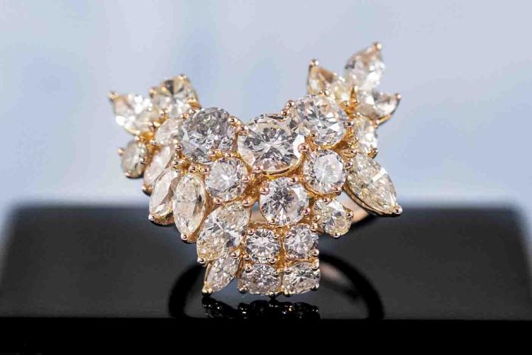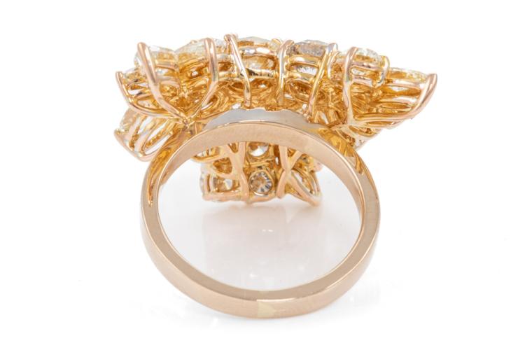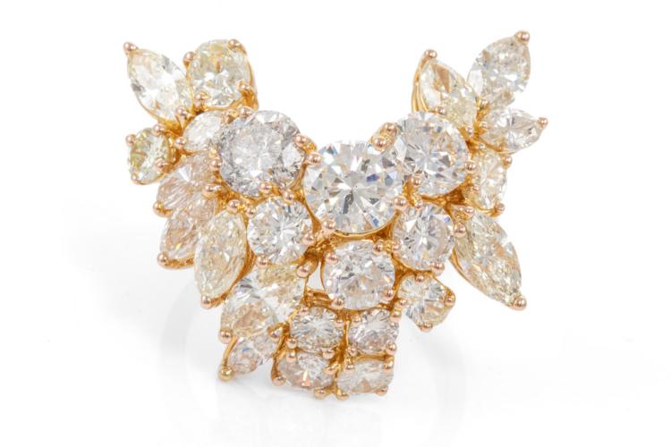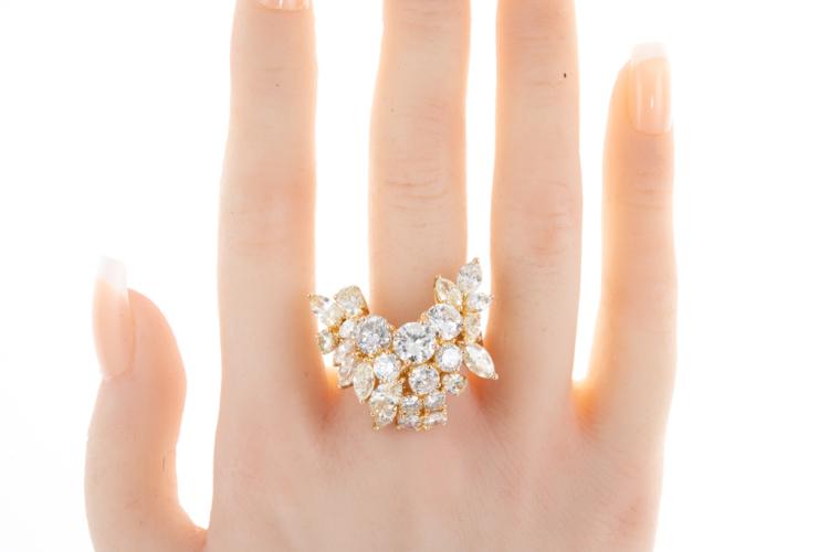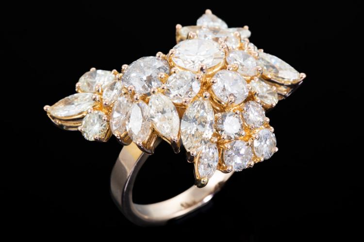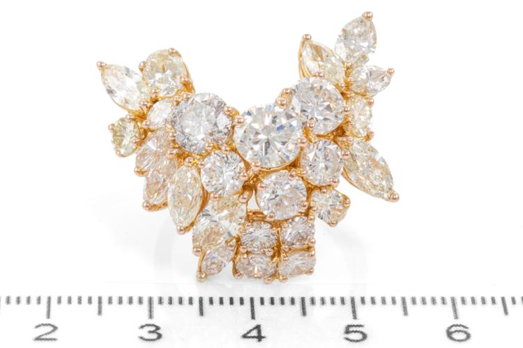 Diamond dress ring with mixed shape Natural Diamonds totalling 11.30cts (Estimated grading: HI-LM SI-P1). 18ct yellow gold. Ring size S. Weight: 16g. Maximum width: 30.0mm. Maximum Length: 30.0mm. With Valuation Certificate #417571. (Pre-owned)