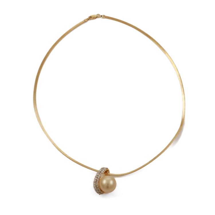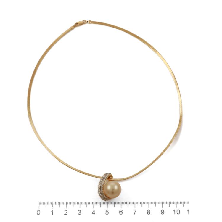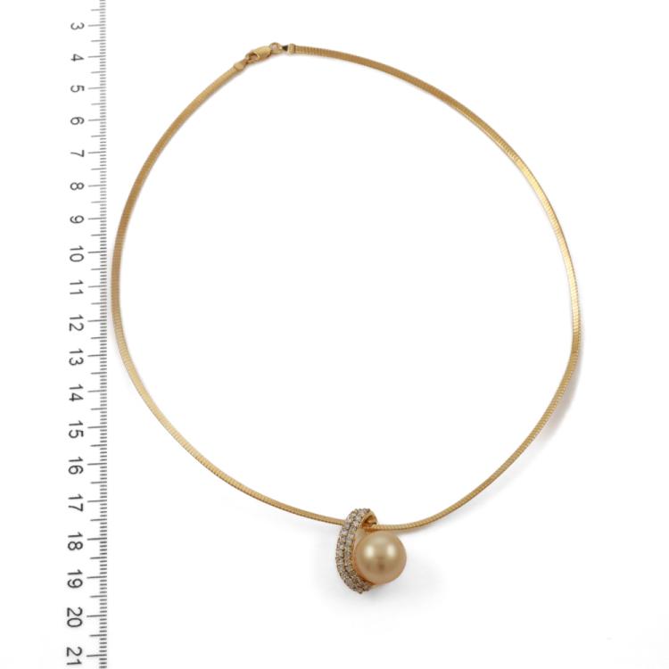 Pearl and Diamond pendant with Golden South Sea Pearl of 12.8mm and round Natural Diamonds totalling 0.60ct (Estimated grading: H-I SI). 18ct yellow gold with 40cm 18ct yellow gold Omega chain. Weight: 13.7g. (Pre-owned)