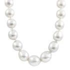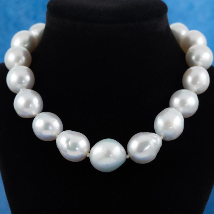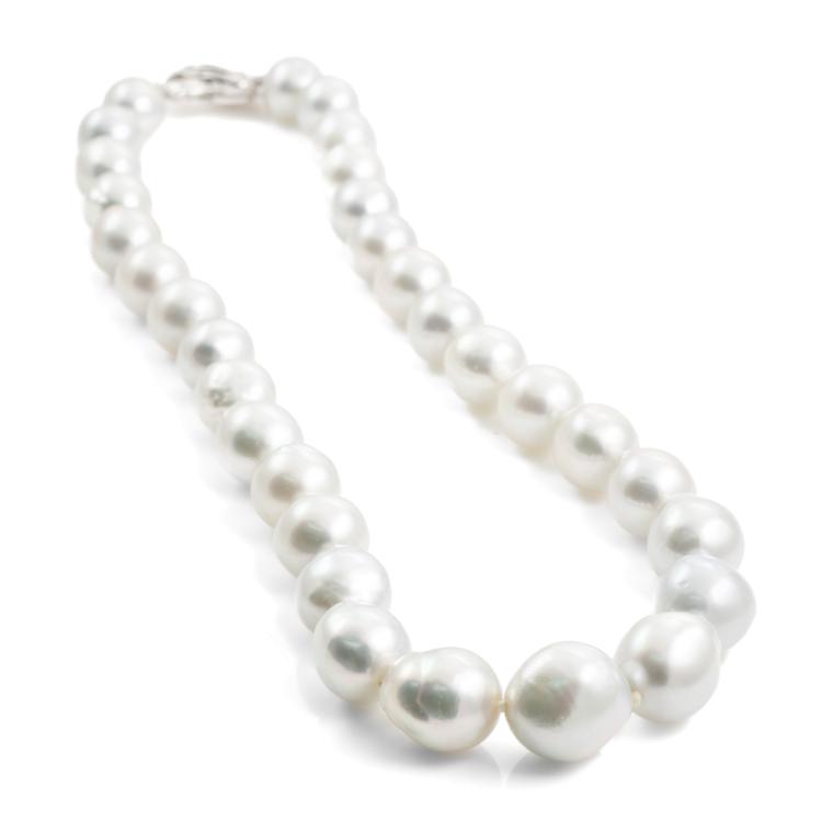 Pearl necklace with silver semi-baroque graduated South Sea Pearls of 14mm-11mm. 14ct white gold clasp set with round Natural Diamonds totalling 0.05cts. Length: 47cm. Weight: 90.8g. With Certificate #418494. (Pre-owned)