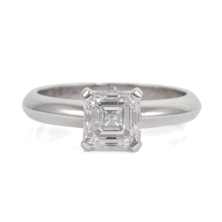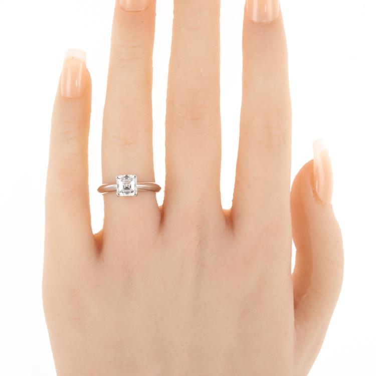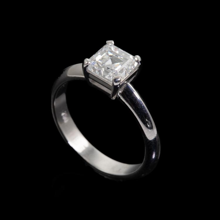 Diamond solitaire ring with square emerald cut natural Diamond of 1.50ct (with GIA Report graded as E SI1 #7441621416). 18ct white gold. Ring size L. Band width: 3mm. Weight: 4.7g. (New)