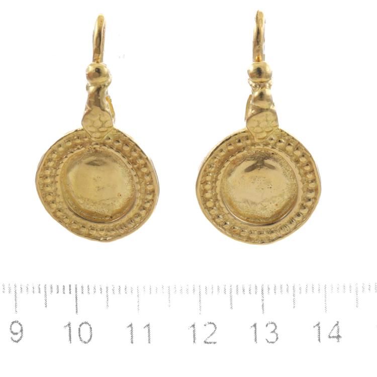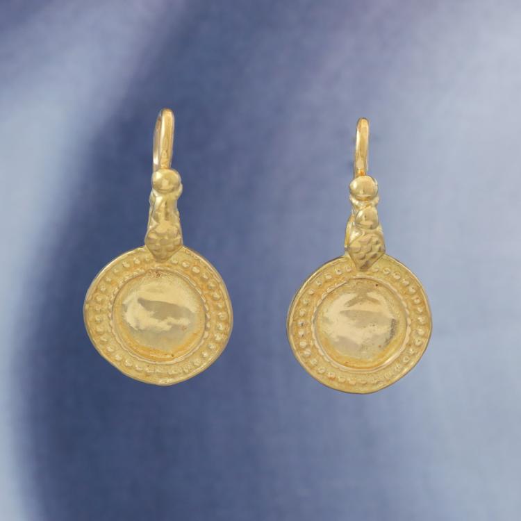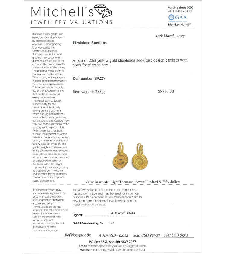 22ct yellow gold shepherds hook earrings with disc feature. Drop length: 3.7cm. Hook thickness: approximately 1.8mm. Weight: 25.0g. With Valuation Certificate #420083. (Pre-owned)