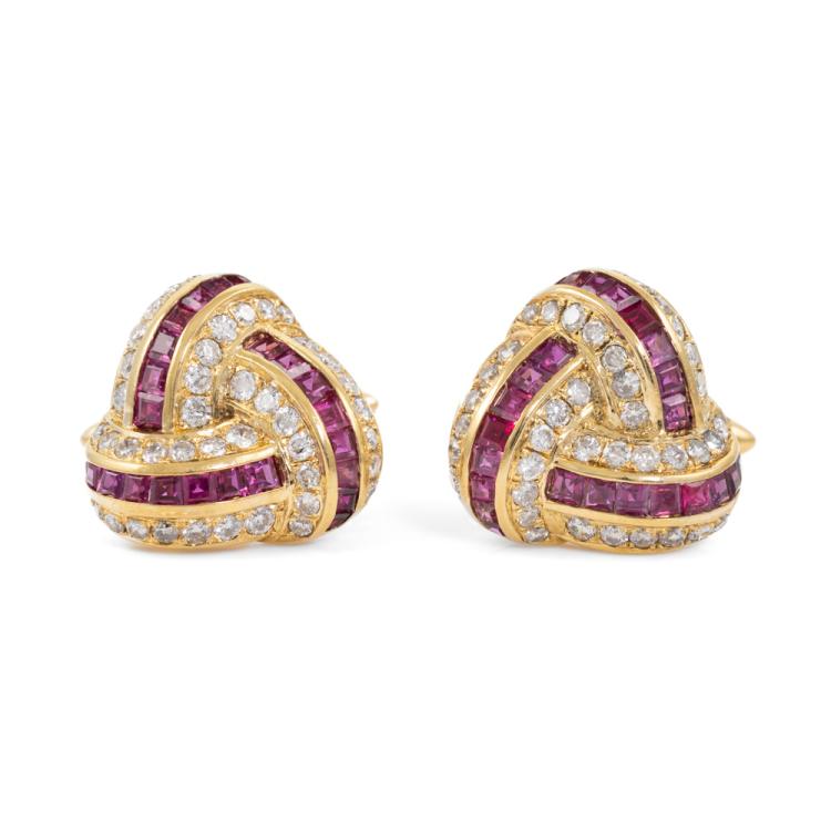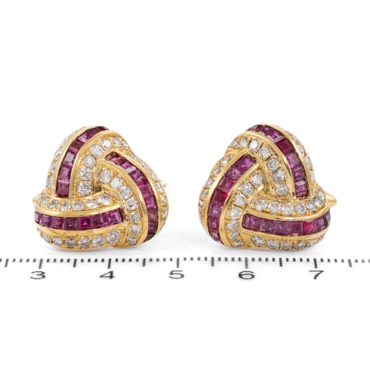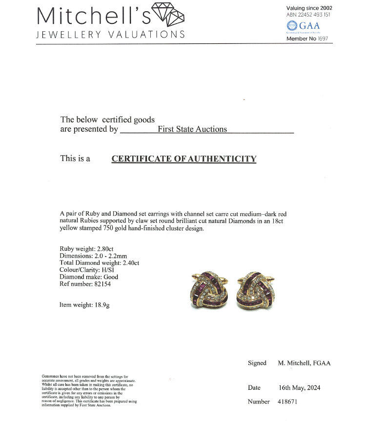 Ruby & Diamond cufflinks with carre cut natural Rubies totalling approximately 2.80ct and round natural Diamonds totalling 2.40ct (Estimated grading: H SI). Motif size: approximately 20mm X 20mm. 18ct yellow gold. Weight: 18.9g. With Certificate #418671. (Pre-owned)