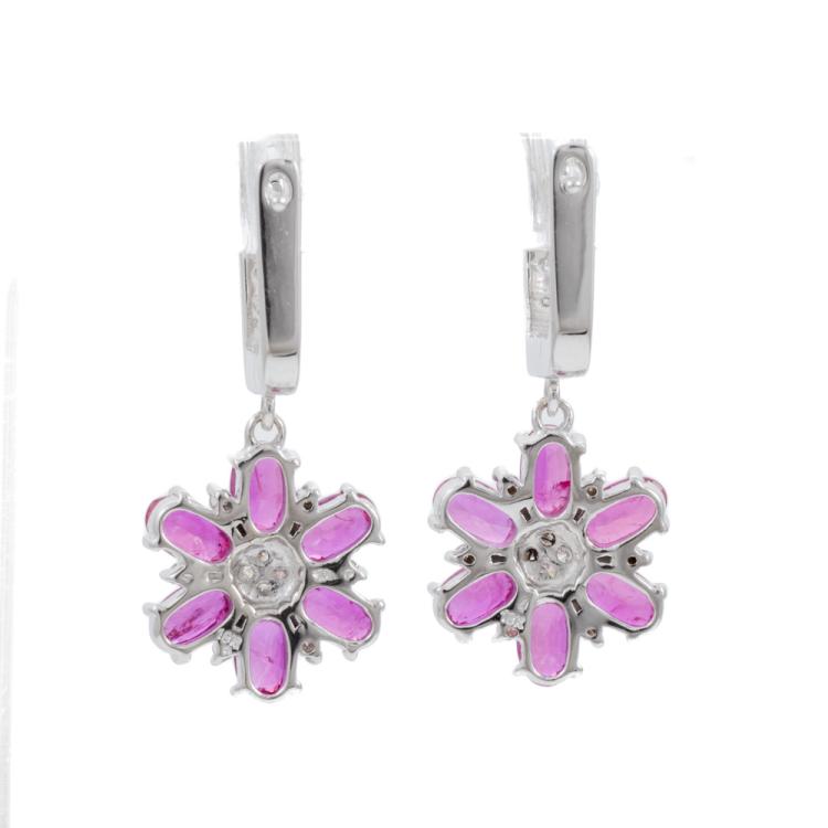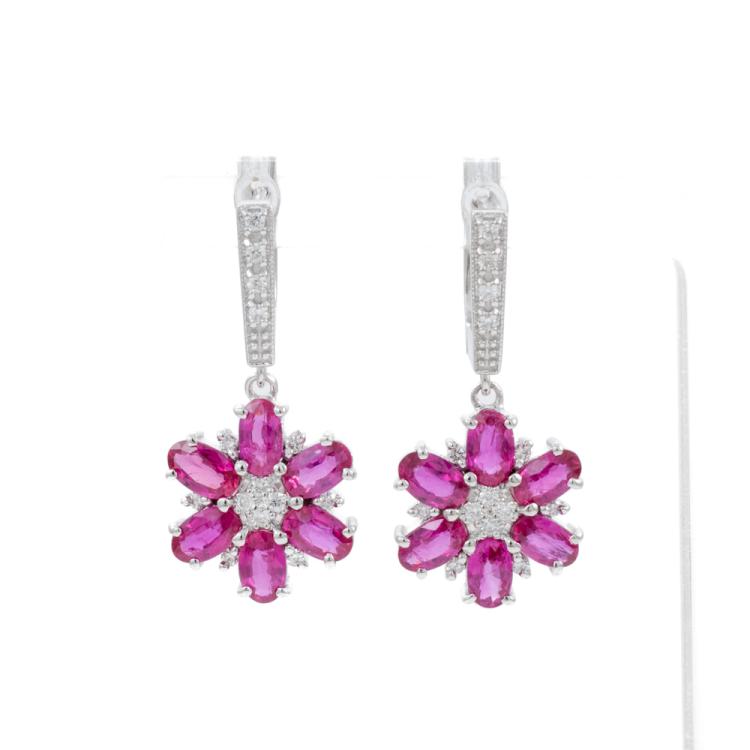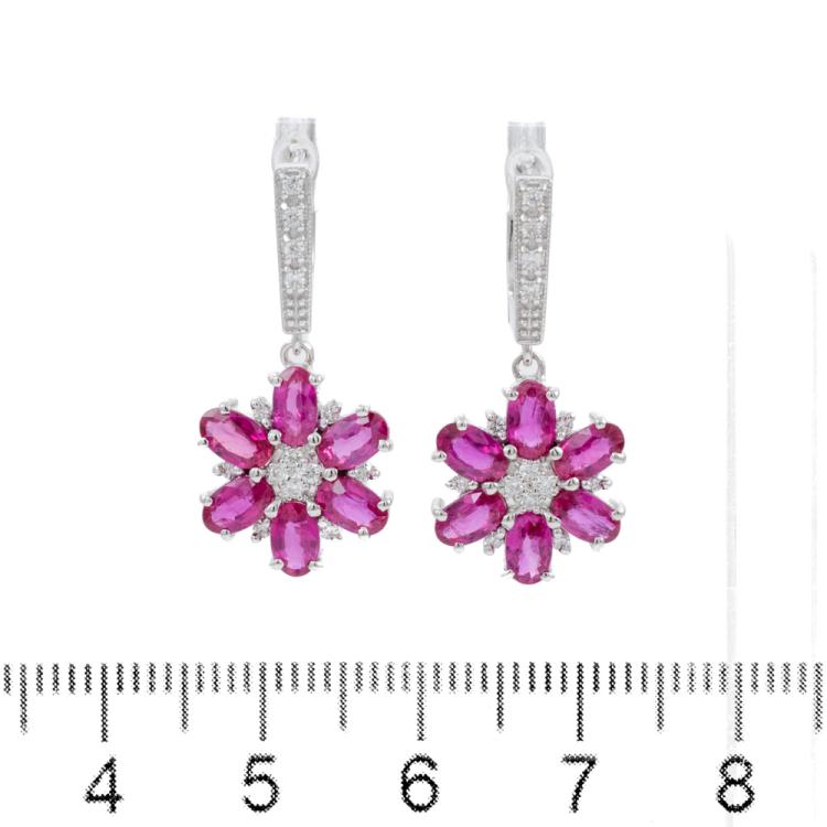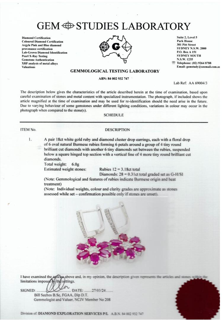 Ruby and Diamond drop earrings with 12 oval shape Natural Burmese Rubies totalling 3.18cts (with GSL Description Report #AA69004/3) and round Natural Diamonds totalling 0.31cts (Estimated grading: G-H SI). 18ct white gold. Weight: 6.0g. (Pre-owned)