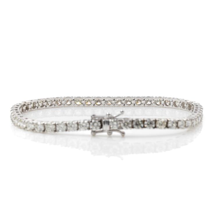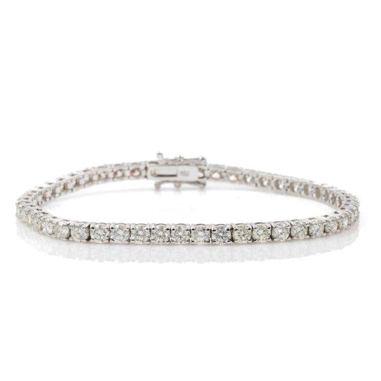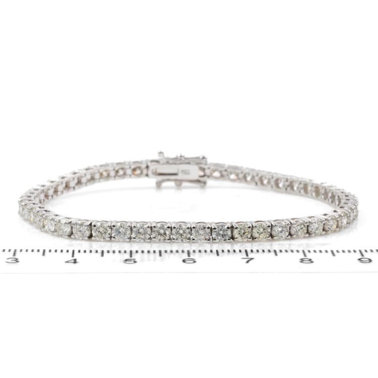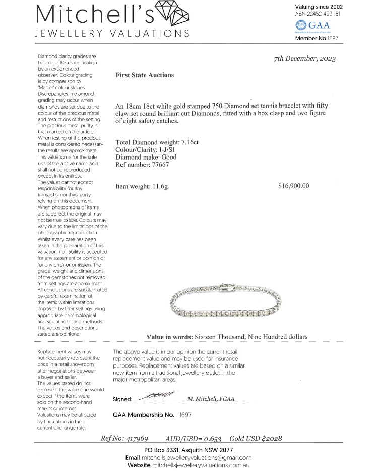 Diamond tennis bracelet with 50 round brilliant cut Natural Diamonds totalling 7.16cts. (Estimated grading: I-J SI). 18ct white gold. Length: 18cm. Weight: 11.6g. With Valuation Certificate #417969. (New)