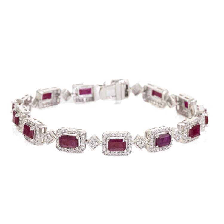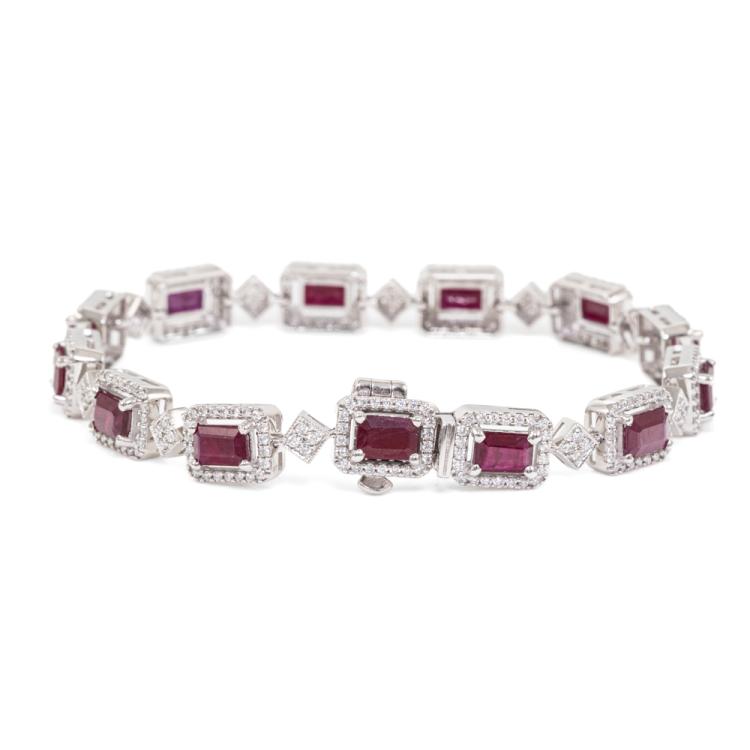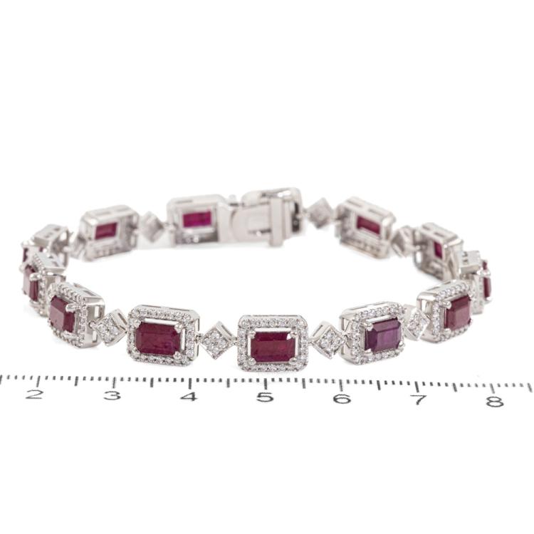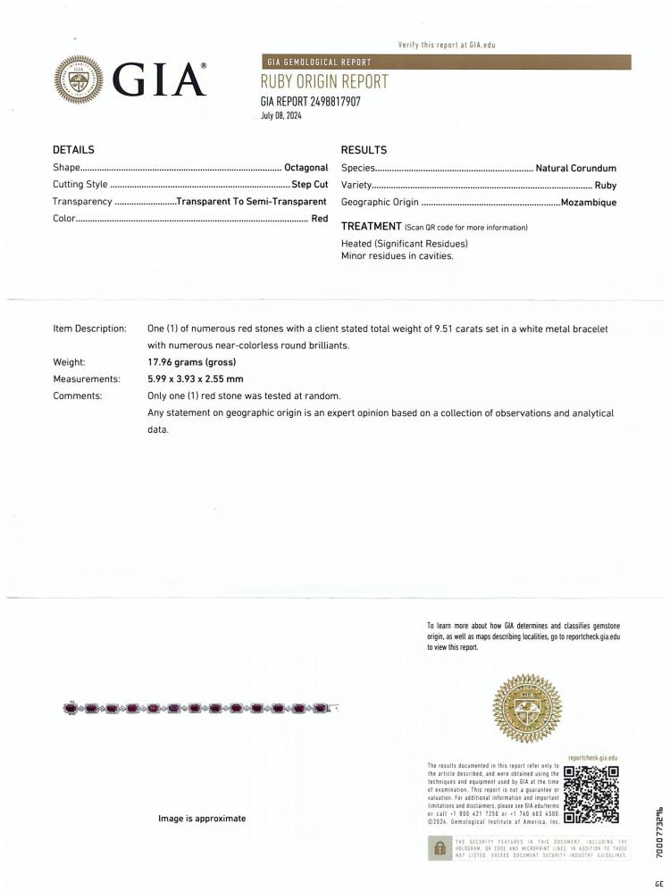Ruby and Diamond Bracelet with octagonal step cut Natural Mozambican Rubies totalling 9.51ct and round Natural Diamonds totalling approximately 1.67ct (FSA estimated grading G-H SI). 14ct white gold. Length: 19.0cm. Weight: 18.0g. With GIA report #2498817907. (As New)