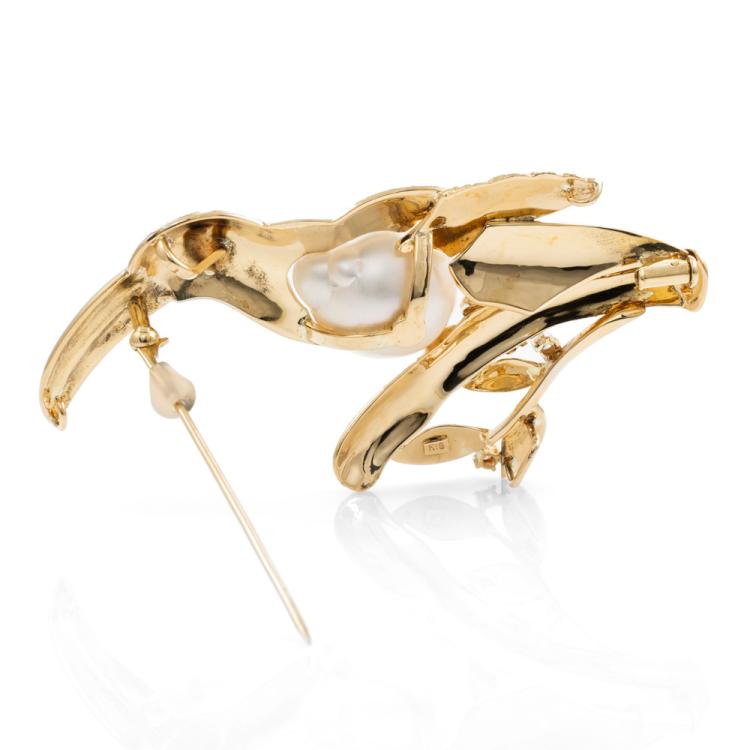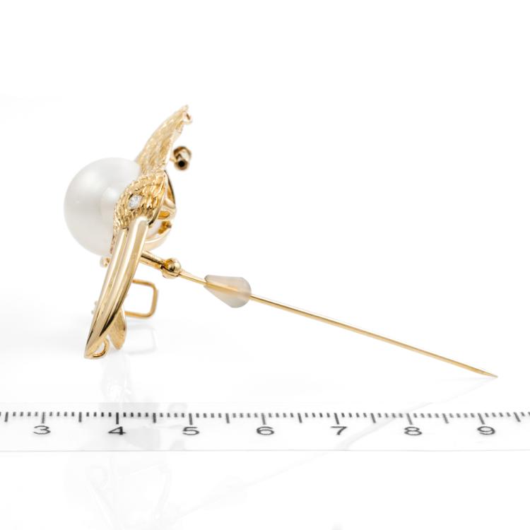 Bird design brooch/pendant with a Baroque South Sea Pearl of 14.9mm x 17.2mm and 3 round Natural Diamonds totalling approximately 0.10cts. 18ct yellow gold. Dimensions: 7cm x 3.5cm. Weight: 22.4g. (Pre-owned)