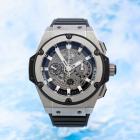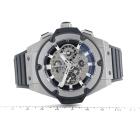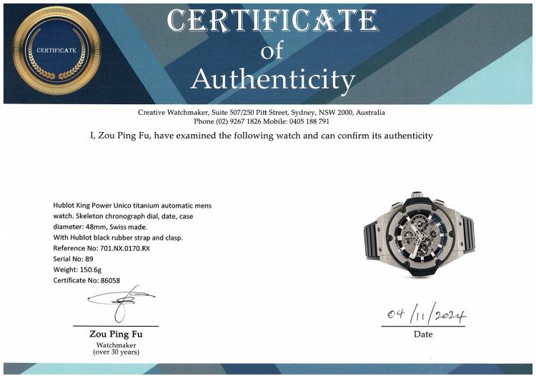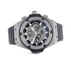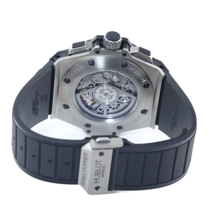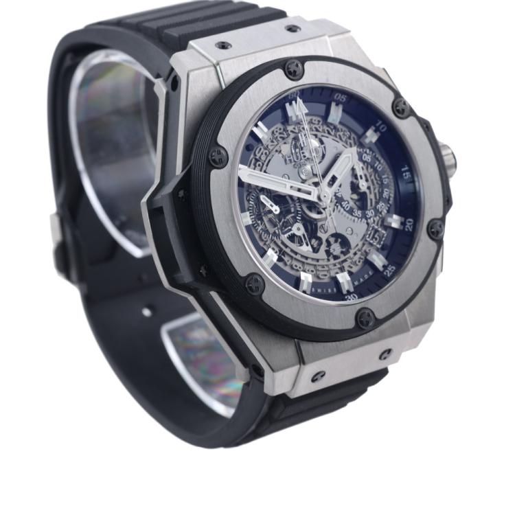 Hublot King Power Unico titanium automatic mens watch. Skeleton chronograph dial, date, case diameter: 48mm, adjustable max wrist size: 19.5cm, Swiss made. Ref #701.NX.0170.RX. With Hublot black rubber strap and clasp. With Certificate of Authenticity and Hublot box. 3 month FSA warranty (Pre-owned)