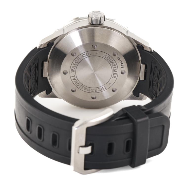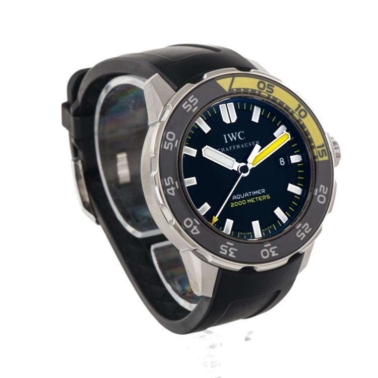 IWC Schaffhausen Aquatimer 2000 stainless steel automatic mens watch. Black dial, date, case diameter: 44mm, strap length: 21cm, Swiss made. Ref# IW356802. With IWC Schaffhausen black rubber strap and buckle. With Certificate of Authenticity, Undated IWC Schaffhausen International Warranty Card and IWC Schaffhausen box. 3 month FSA warranty. (Pre-owned)
