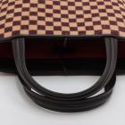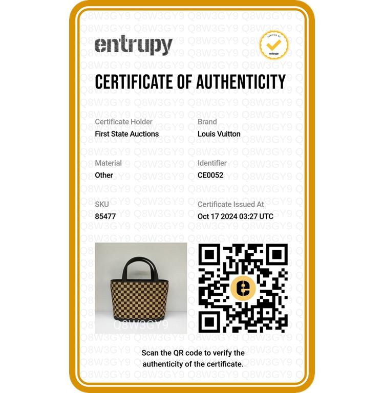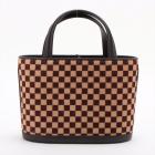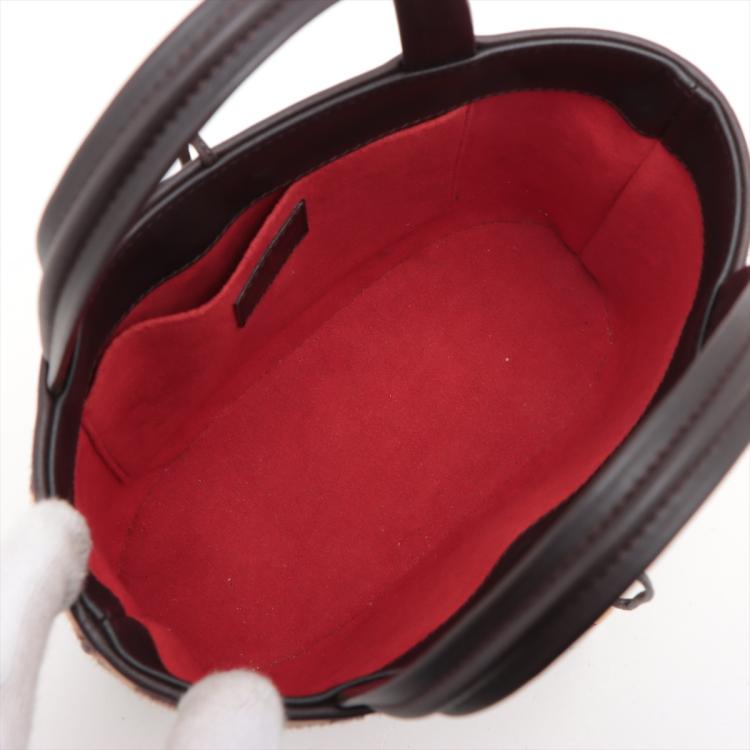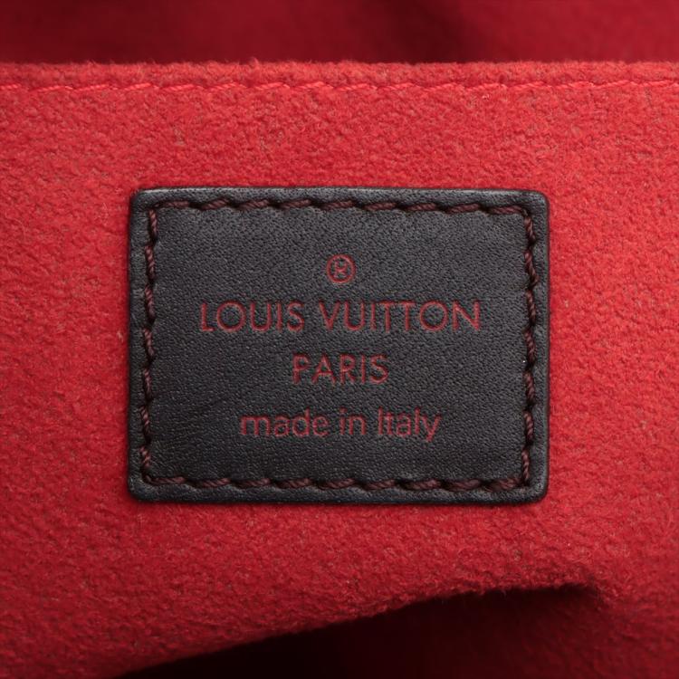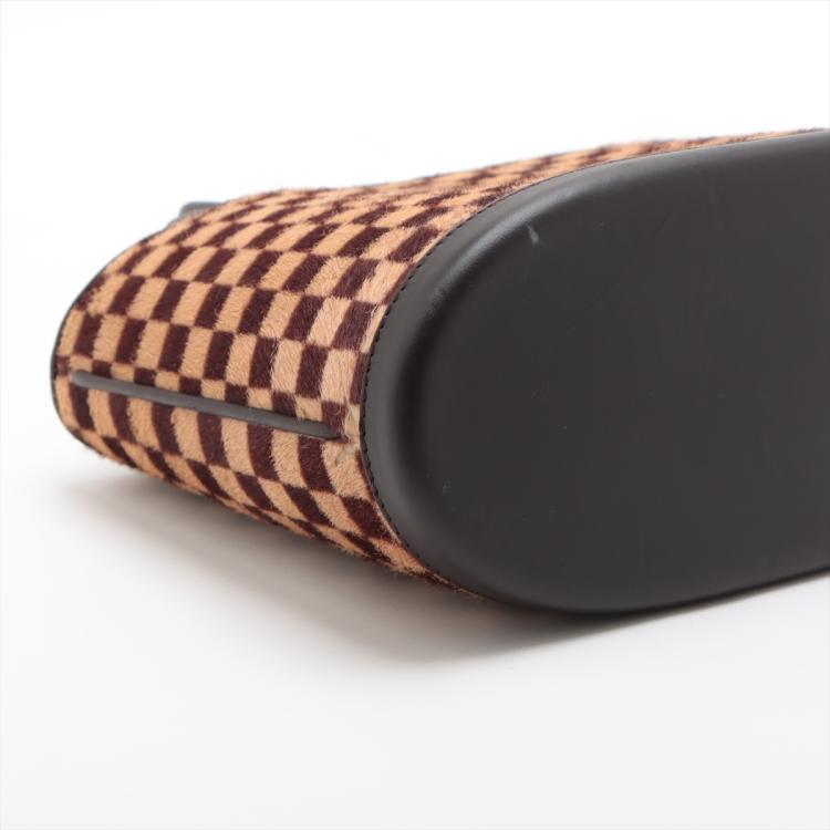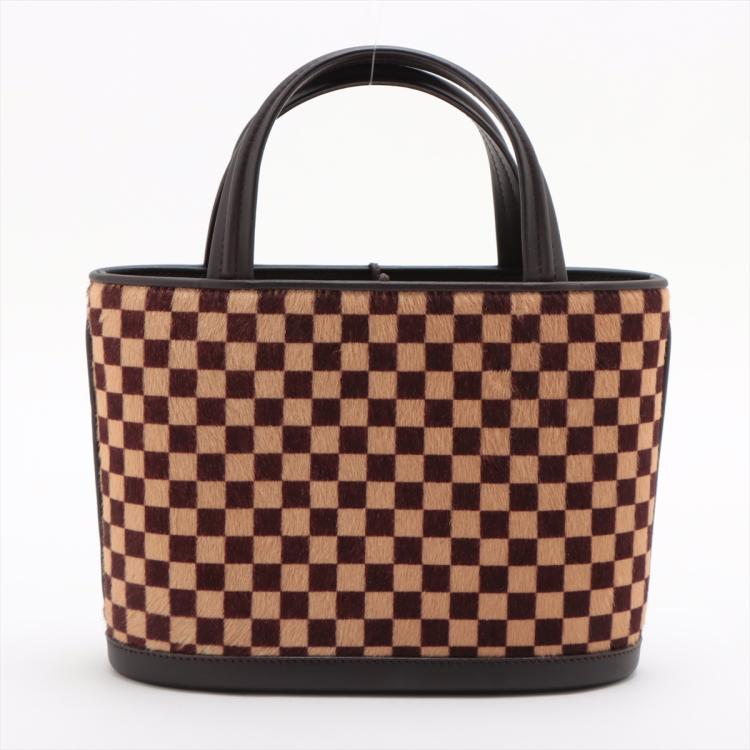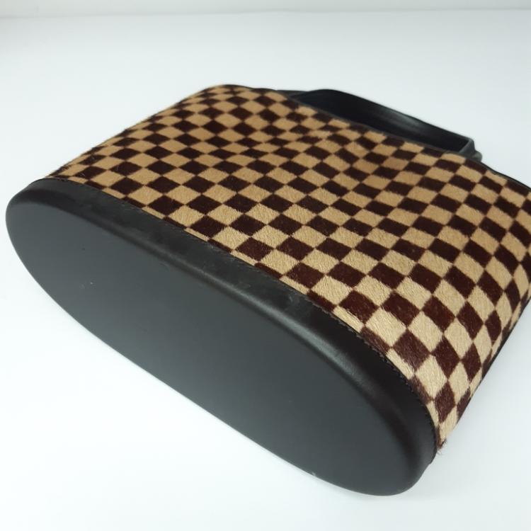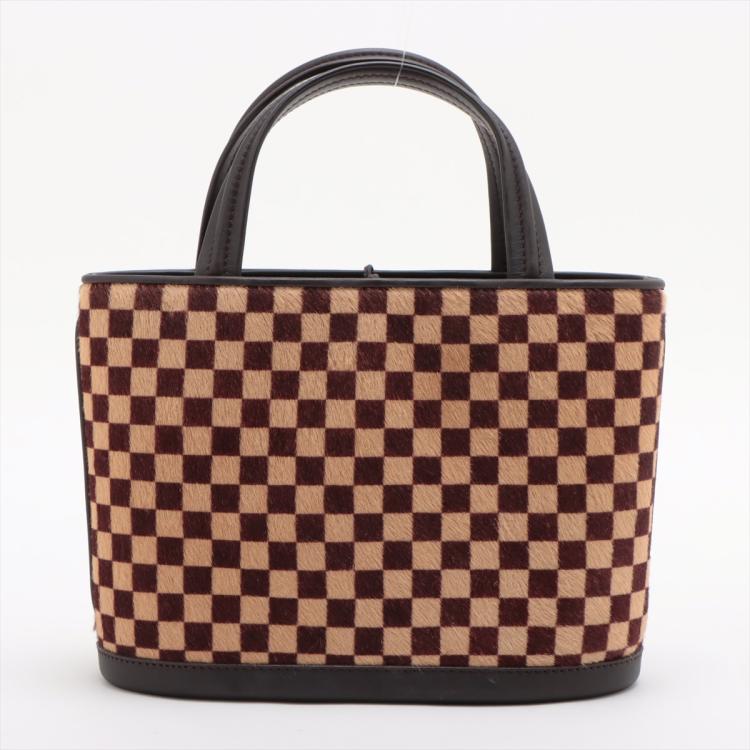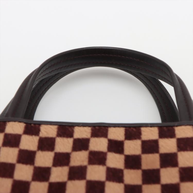 Louis Vuitton Sauvage Impala in Damier checkered pattern in pony hair with brown leather trims. Featuring gold-toned hardware, leather base, double leather handles, and leather strings closure. This opens to an orange microfibre interior with a patch pocket. Approximate dimensions: 20cm(Base-L) x 15cm(H) x 9cm(D), handle drop 7.5cm. With Entrupy Certificate of Authenticity. (Pre-owned)