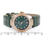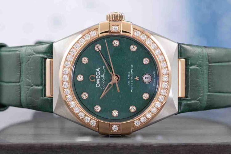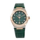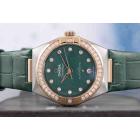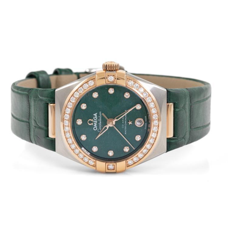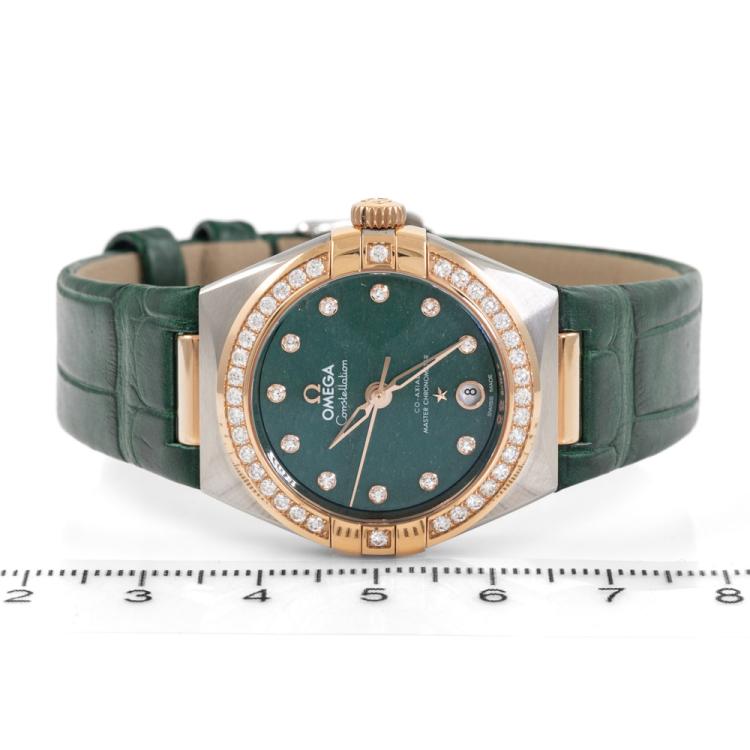 Omega Constellation Sedna gold and stainless steel automatic ladies watch. Green dial, Diamond indicators and set bezel, date, case diameter: 29mm, strap length: 18cm, Swiss made. Ref# 131.28.29.20.99.001. With Omega green leather strap and clasp. With Undated Omega International Warranty card, Pictograms card, Precious Stones Certificate card & Master chronometer card. 3 month FSA warranty (As new, Note: wear marks on strap due to being display stock)