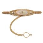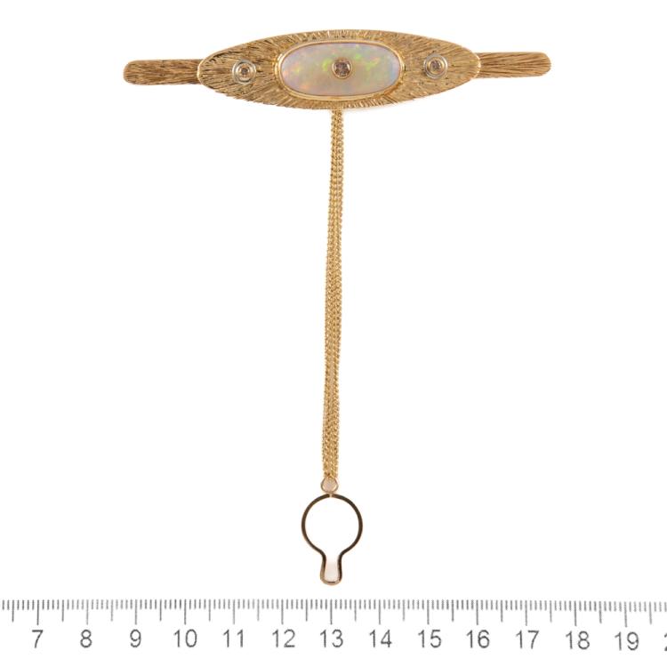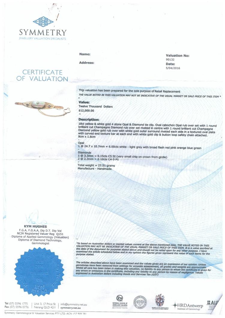 Handmade Tie Pin with an oval cabochon cut solid Natural Opal and 3 round Natural Diamonds totalling 0.35ct (Estimated grading: C4-5 SI-P1). 18ct yellow and white gold with safety chain. Weight: 27.5g. With copy of valuation dated 05/04/16. (Pre-owned)