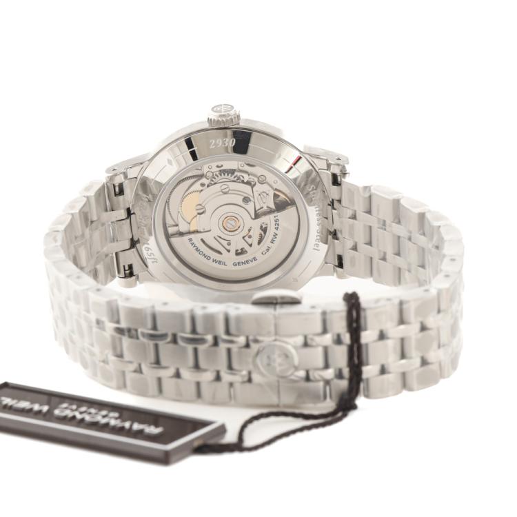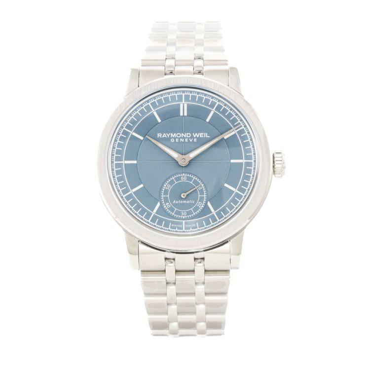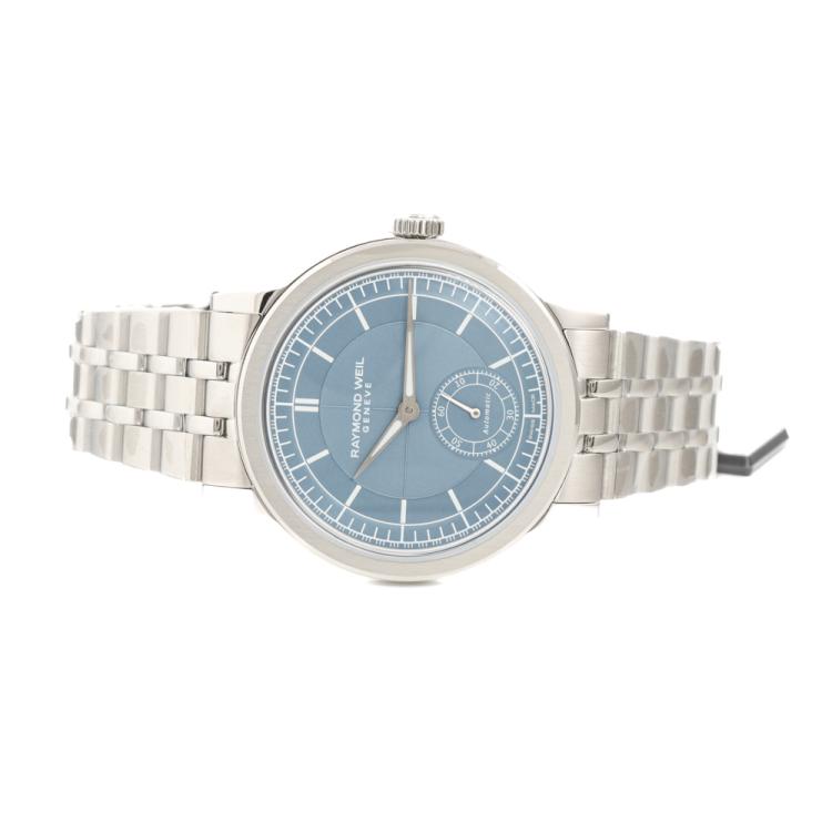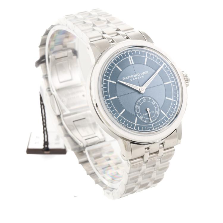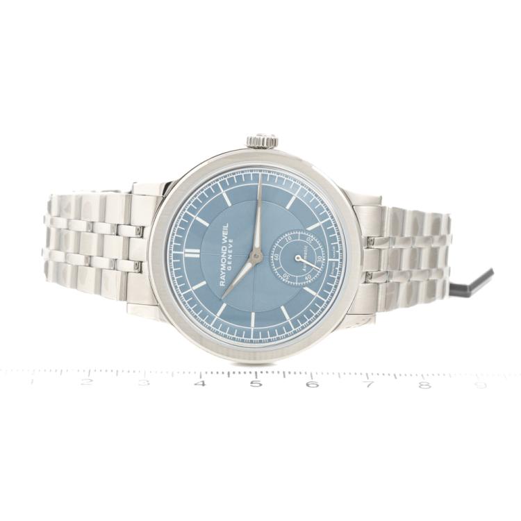 Raymond Weil Millesime stainless steel automatic mens watch. Blue dial, small seconds, case diameter: 39.5mm, wrist size: 19.5cm, Swiss made. Ref# 2930-ST-50011. With Raymond Weil stainless steel bracelet and clasp. With Undated Raymond Weil Guarantee card and Raymond Weil box. 12 month FSA warranty. (As new, Note: case and bracelet on original wrap)