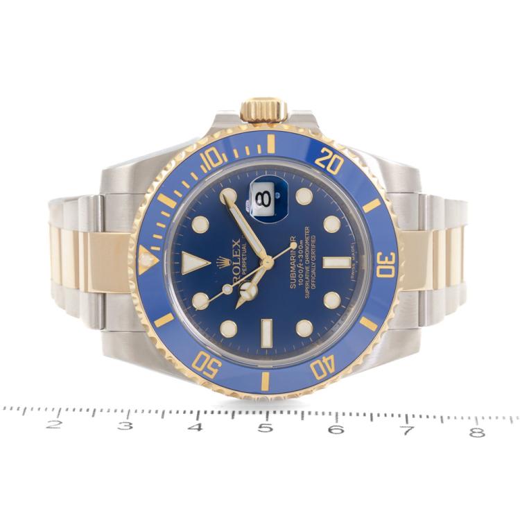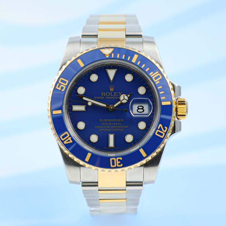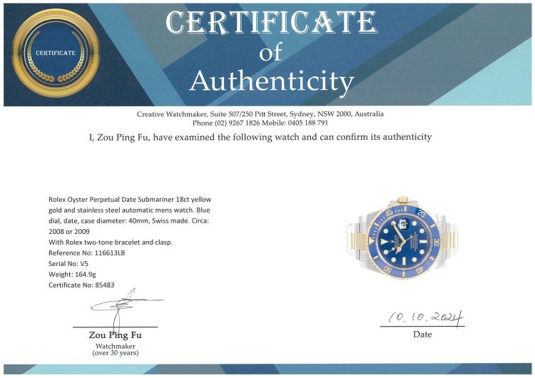 Rolex Oyster Perpetual Date Submariner 18ct yellow gold and stainless steel automatic mens watch. Blue dial, date, case diameter: 40mm, wrist size: 18.5cm, Swiss made. Ref# 116613LB. Circa: 2008 or 2009. With Rolex two-tone bracelet and clasp. With Certificate of Authenticity and Rolex box. 3 month FSA warranty (Pre-owned)