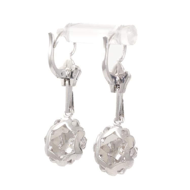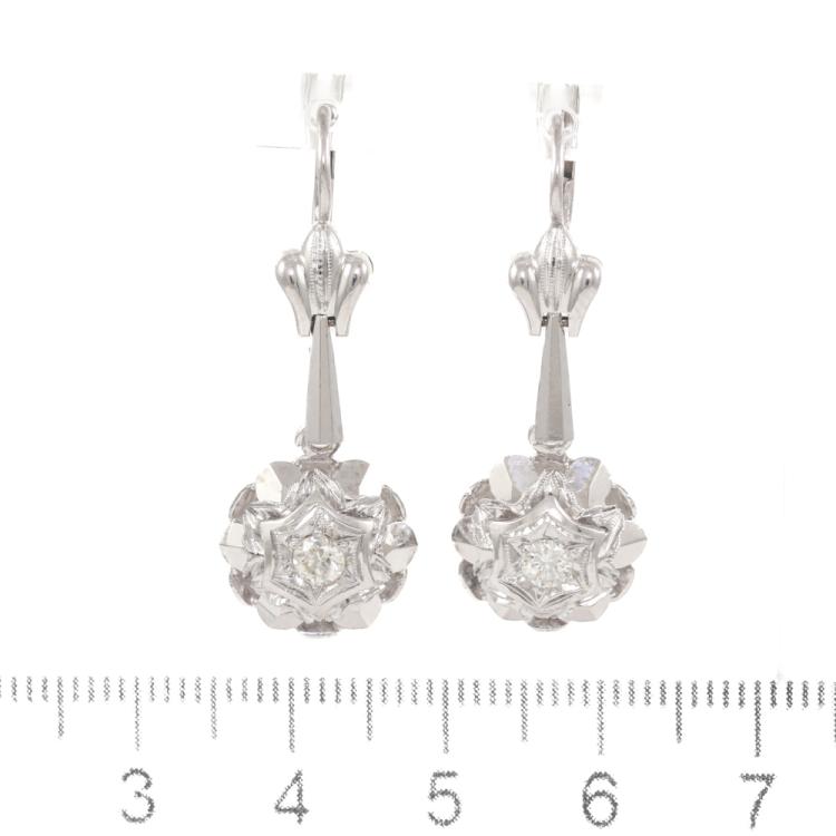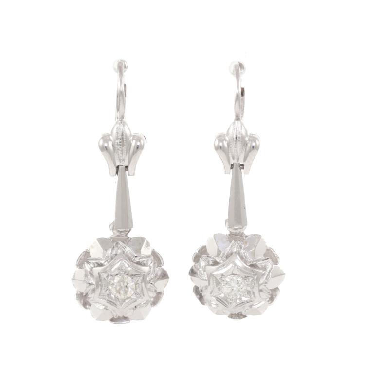 Florette shape dangle earrings with round Natural Diamonds totalling approximately 0.20ct. 18ct white gold. Earring drop length: 3.3cm. Weight: 5.1g. (Pre-owned)