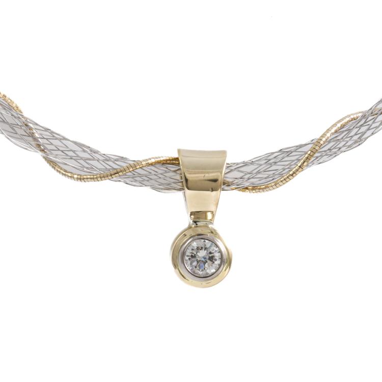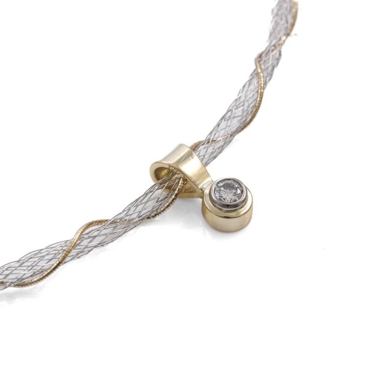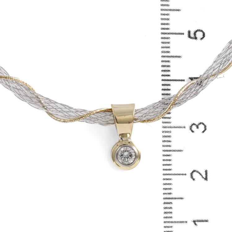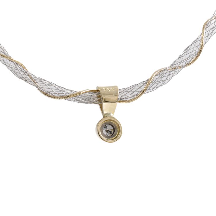 Diamond solitaire pendant with round Natural Diamond of approximately 0.21ct. 18ct yellow gold with 43.5cm 18ct yellow and white gold wire mesh chain. Weight: 6.0g. (Pre-owned)