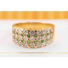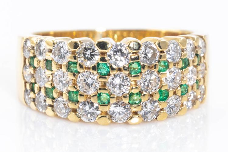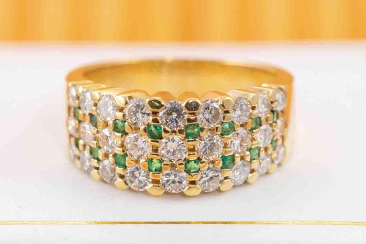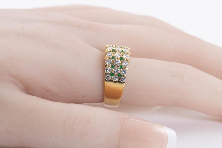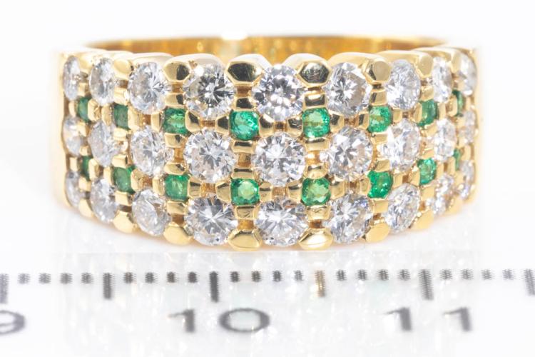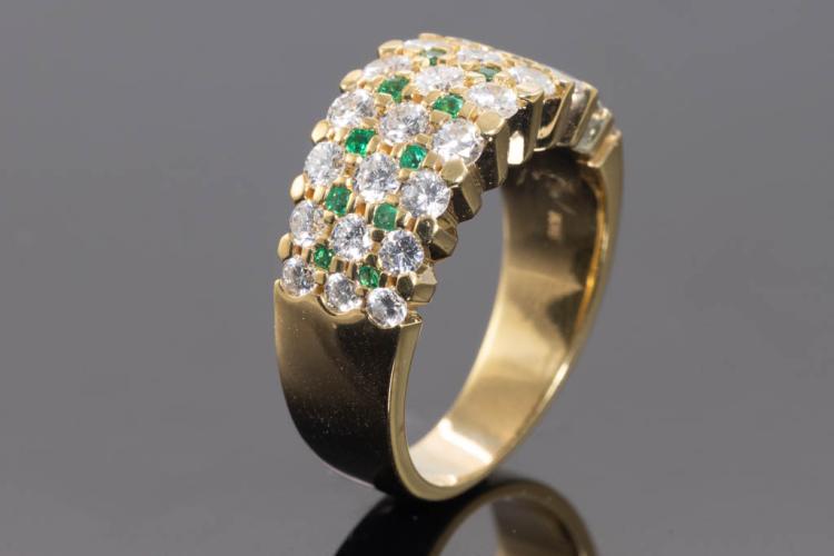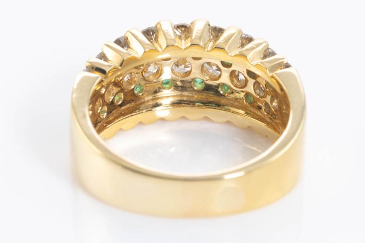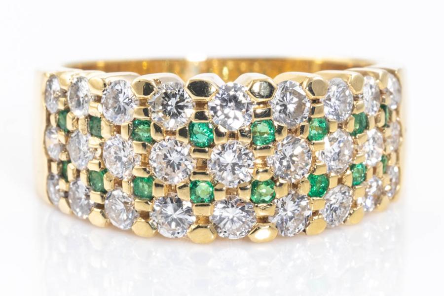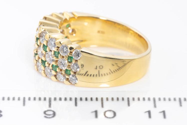 Emerald and Diamond ring with round Natural Emerald totalling 0.23ct and round Natural Diamonds totalling 1.63ct (Estimated grading: G-H SI). 18ct yellow gold. Ring size O1/2. Weight: 10.6g. (Pre-owned)
