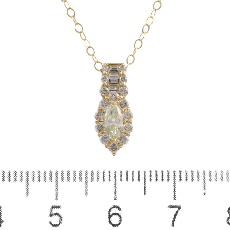 Diamond pendant with centre marquise cut Natural Diamond of 0.25ct (Estimated grading: Fancy Light Yellow SI) and round & baguette Natural Diamonds totalling 0.40ct (Estimated Grading: H-I VS-SI). 18ct Yellow gold with 41cm 18ct yellow gold chain. Weight: 2.2g. (Pre-owned)