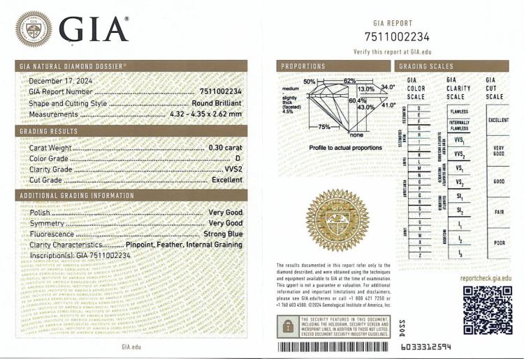 A loose round brilliant cut natural Diamond of 0.30ct (with GIA Dossier Report graded as D VVS2 #7511002234). (New)