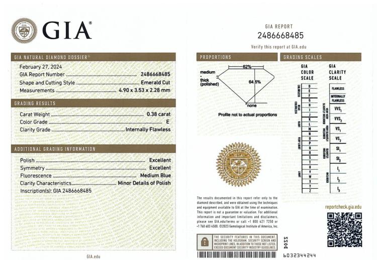 A loose emerald cut Natural Diamond of 0.38ct (with GIA report graded as E Internally Flawless# 2486668485