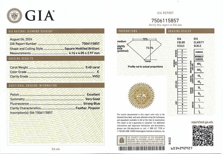 A loose princess cut Natural Diamond of 0.40ct (with GIA Dossier report graded as E VVS2 # 7506115857). (New)