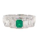 Emerald and Diamond ring with emerald cut Natural Emerald of 0.41ct and baguette cut Natural Diamonds totalling 0.65ct (Estimated grading: G VS). Platinum - 900. Ring size: M. Band width: 5.1mm - 2.8mm. Weight: 9.7g. (Pre-owned)