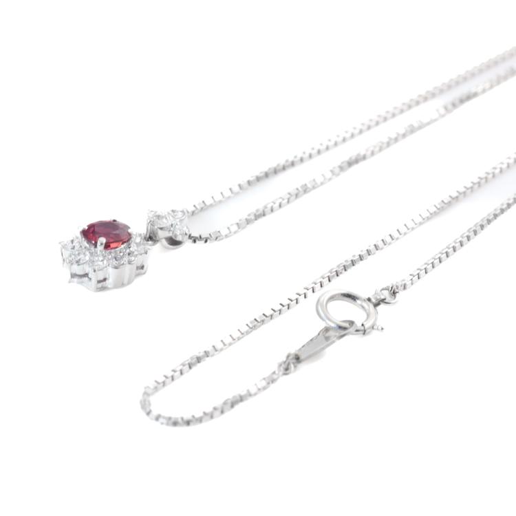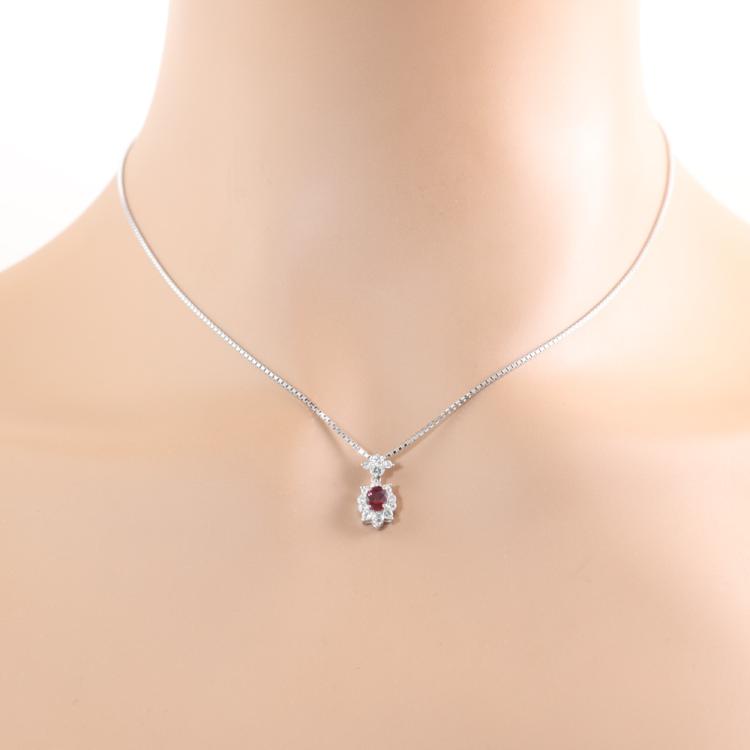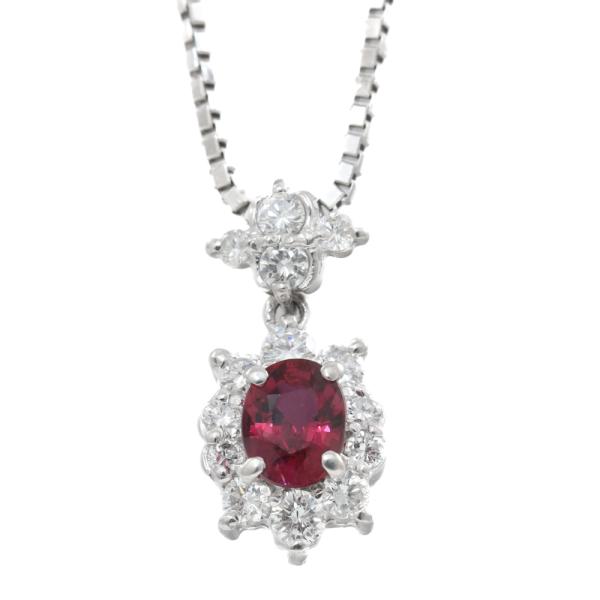 Ruby and Diamond pendant with oval shape Natural Ruby of 0.43ct and round Natural Diamonds totalling 0.29ct. Platinum - 900 with 40cm Platinum - 850 adjustable chain. Weight: 5.5g. (Pre-owned)