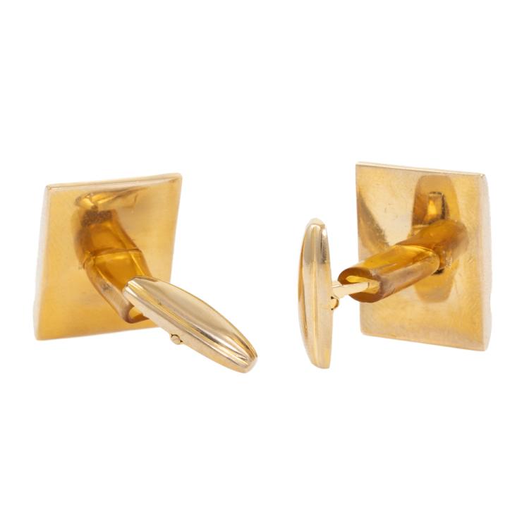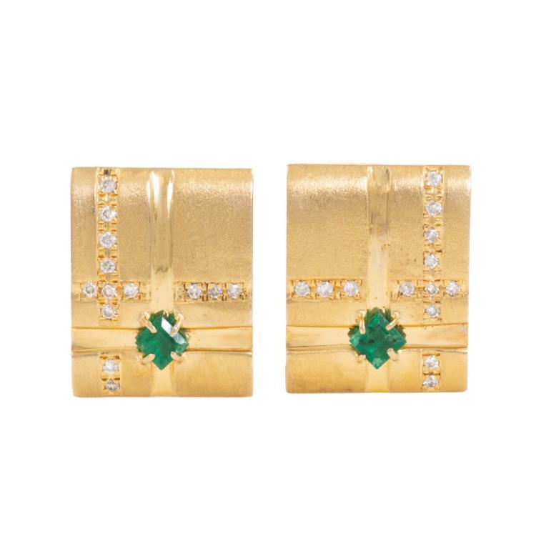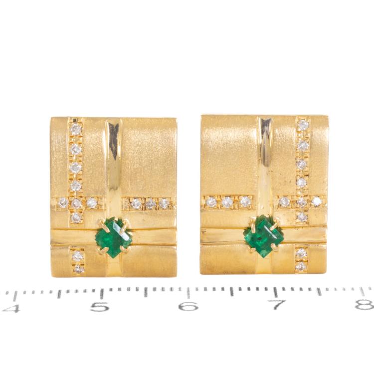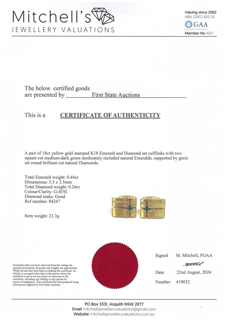 Emerald and Diamond cufflinks with square cut Natural Emeralds totalling 0.44ct and round Natural Diamonds totalling 0.24ct. 18ct yellow gold. Weight: 21.3g. With Certificate #419032. (Pre-owned)