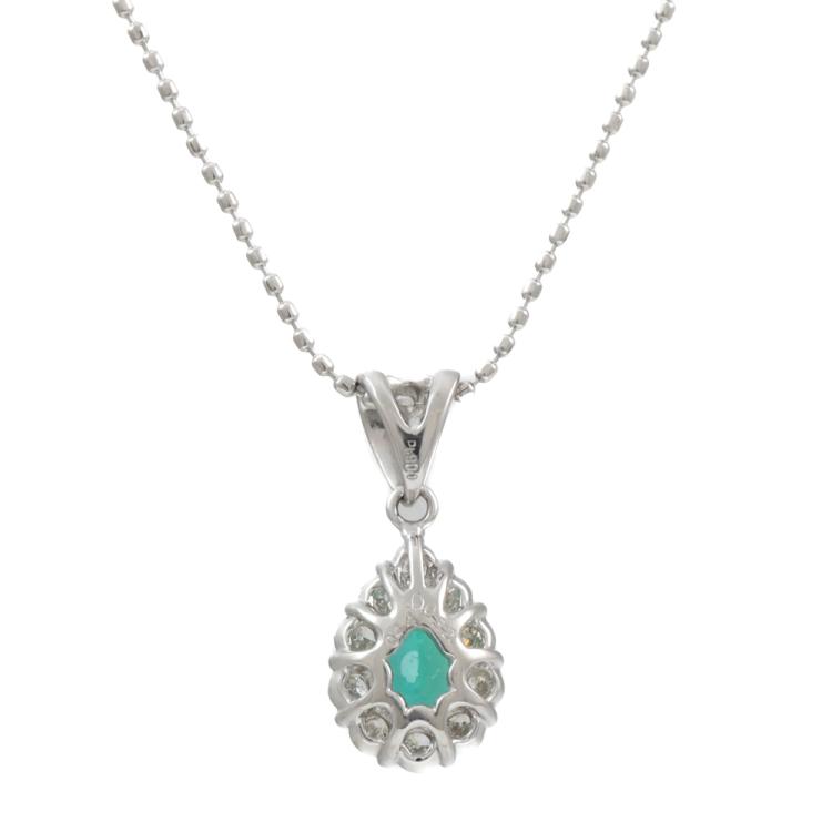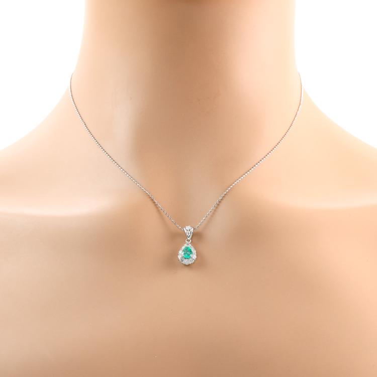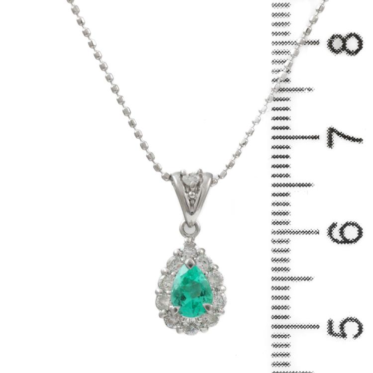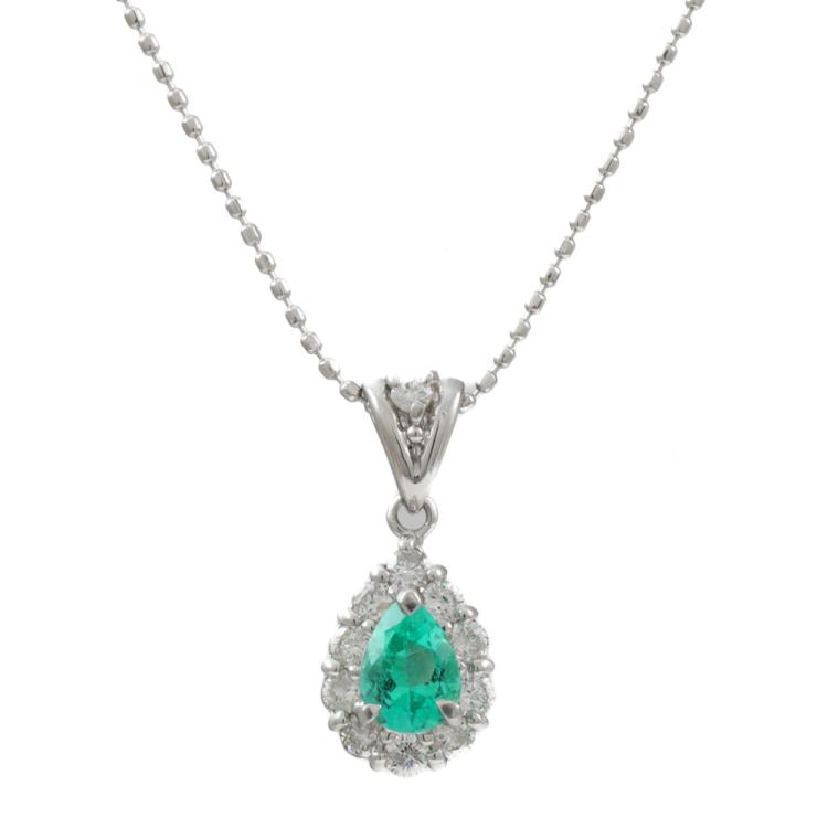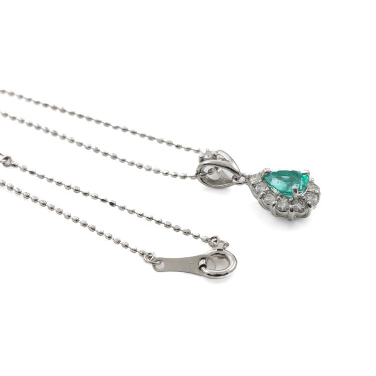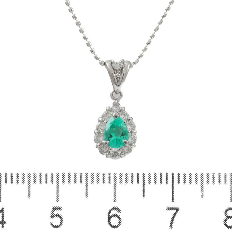Emerald and Diamond pendant with pear shape Natural Emerald of 0.44ct and round Natural Diamonds totalling 0.32ct (Estimated Grading: G-H SI-P1). Platinum - 900 with 40cm Platinum - 850 chain. Weight: 3.2g. (Pre-owned)