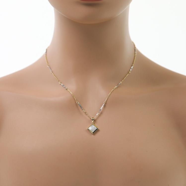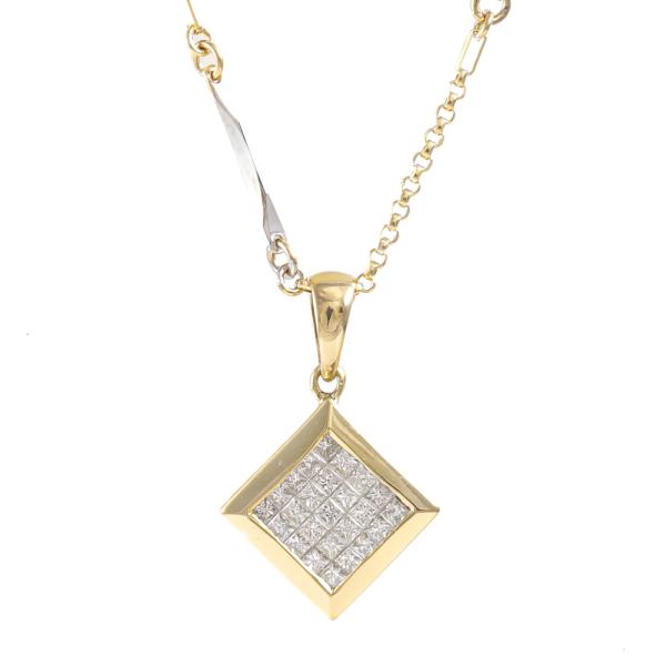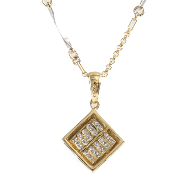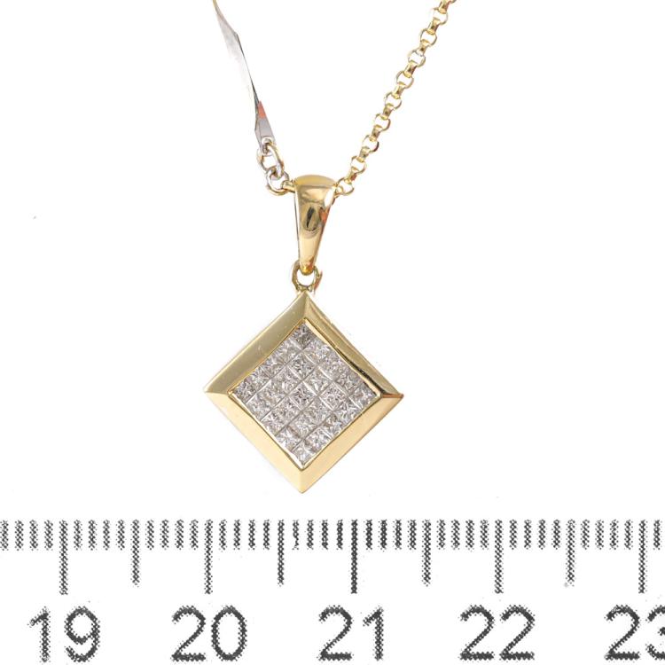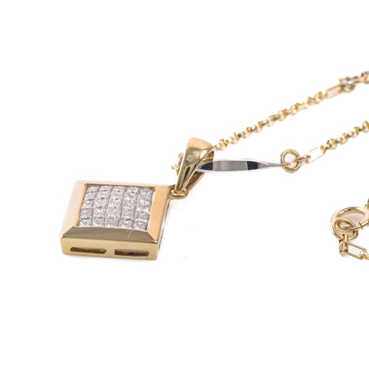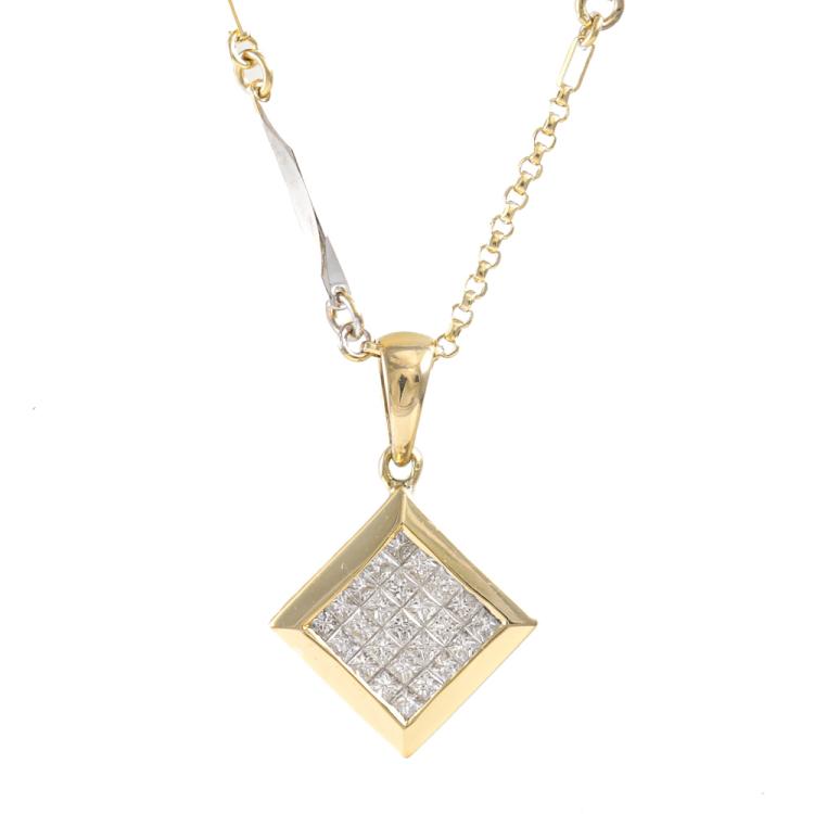 Diamond dress pendant with invisible set princess cut Natural Diamonds totalling approximately 0.50ct (Estimated grading: I-J SI). 18ct yellow gold with 18ct yellow & white gold 44.5cm chain. Weight: 5.2g. (Pre-owned)