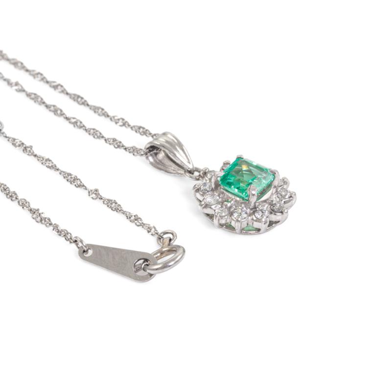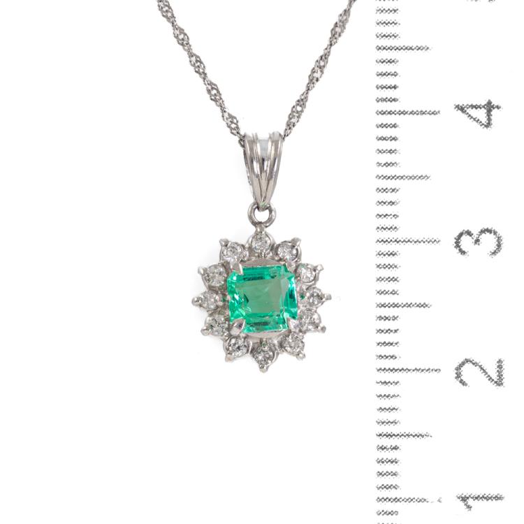 Emerald and Diamond pendant with square emerald cut Natural Emerald of 0.50ct and round Natural Diamonds totalling 0.22ct. Platinum - 900 with Platinum 850 chain. Adjustable chain length: 37.0cm - max 40.0cm. Weight: 3.0g. (Pre-owned)