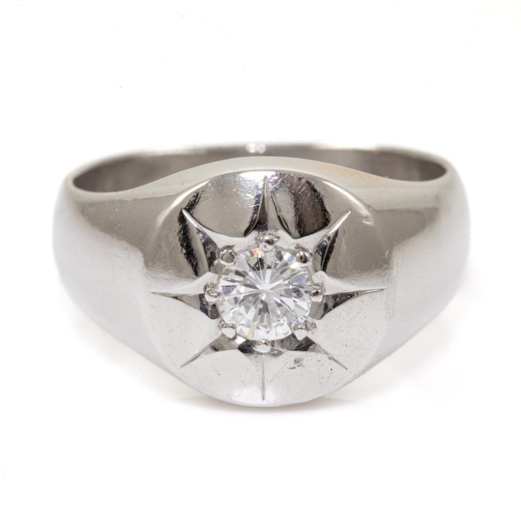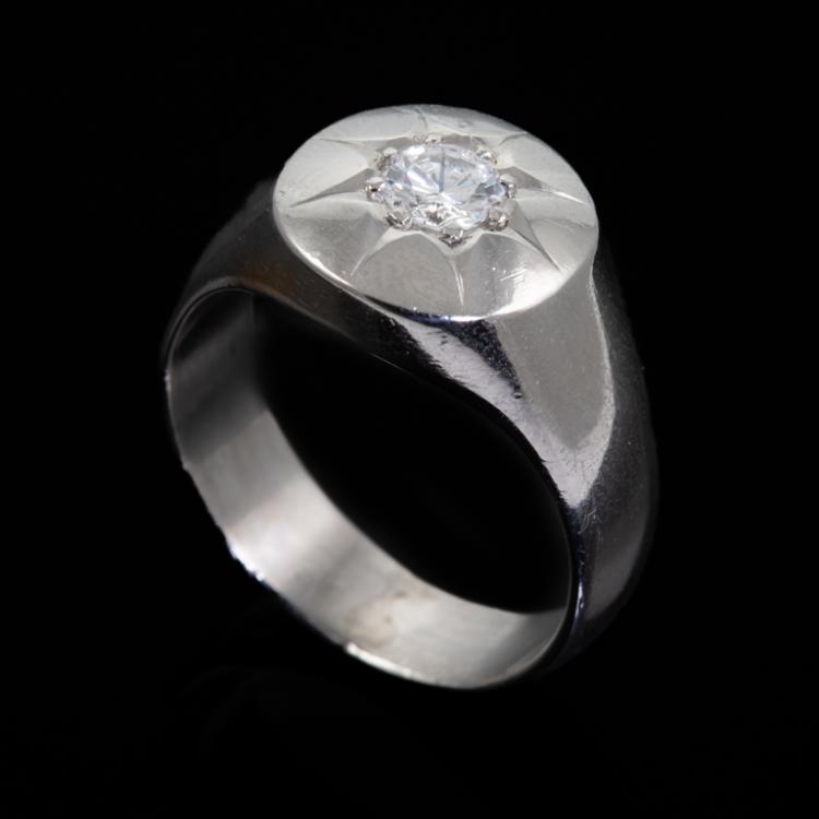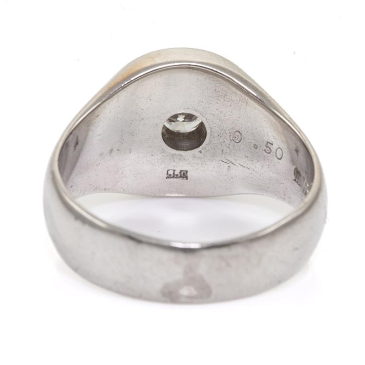 Diamond mens ring with a round Diamond of 0.50ct (Estimated grading: H SI) Platinum - 850. Ring size V1/2. Band width: 5.8mm - 7.6mm. Weight: 21.8g. (Pre-owned)