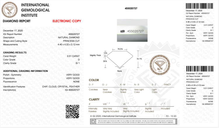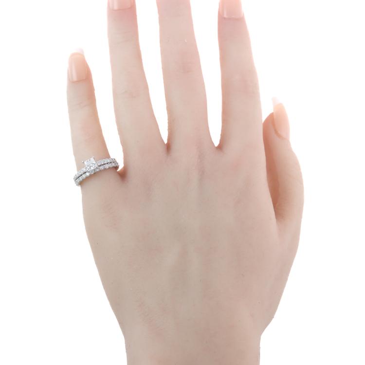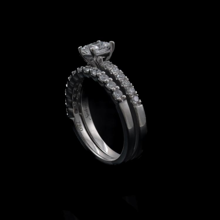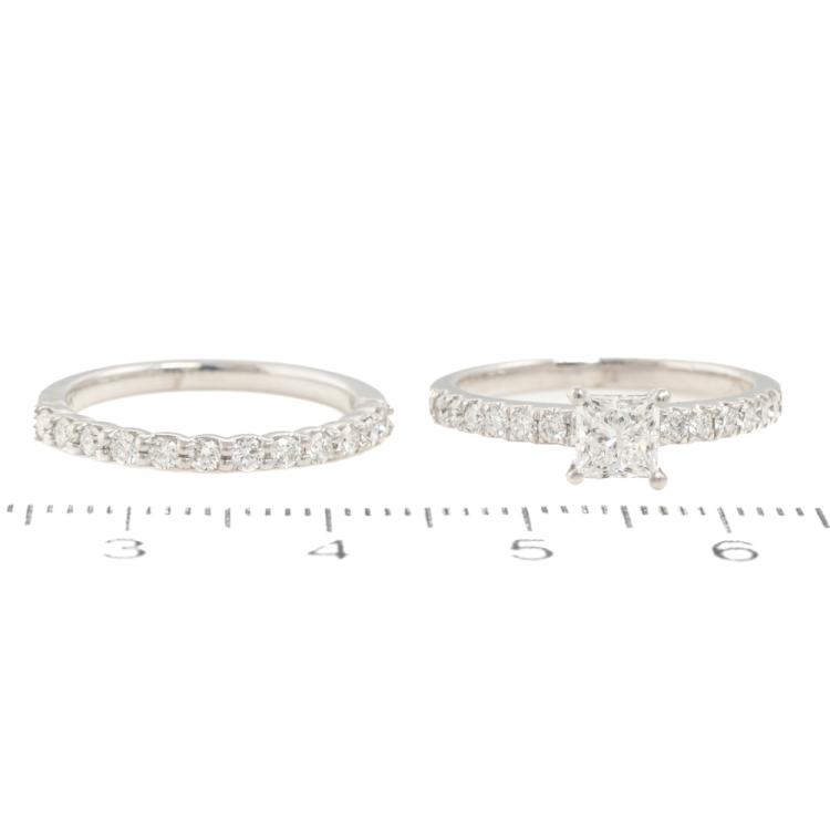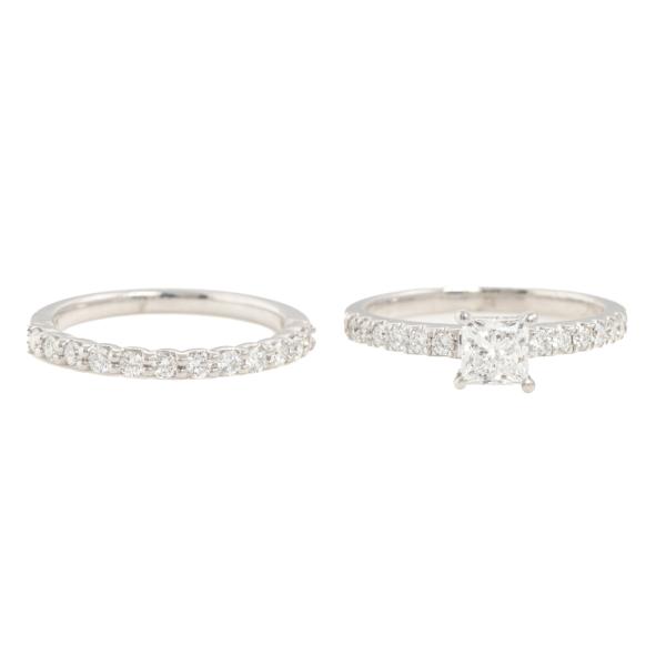 Engagement ring set. 1) Diamond solitaire ring with centre princess cut Natural Diamond of 0.51ct (With copy of IGI Report graded as D SI1 #455020727) and round Natural Diamonds totalling approximately 0.24ct. 18ct white gold. Ring size: J. Band width: 1.8mm. 2) Matching eternity ring with round Natural Diamonds totalling approximately 0.24ct. Ring size: I 3/4. Band width: 1.7mm - 1.9mm. Combined weight: 5.1g. Both engraved with "Salera's". (Pre-owned)