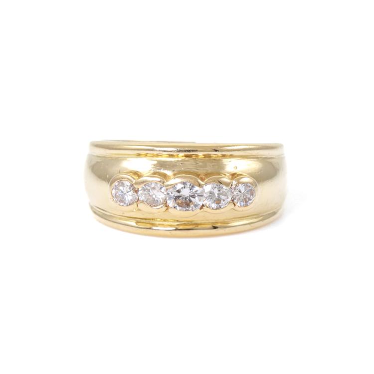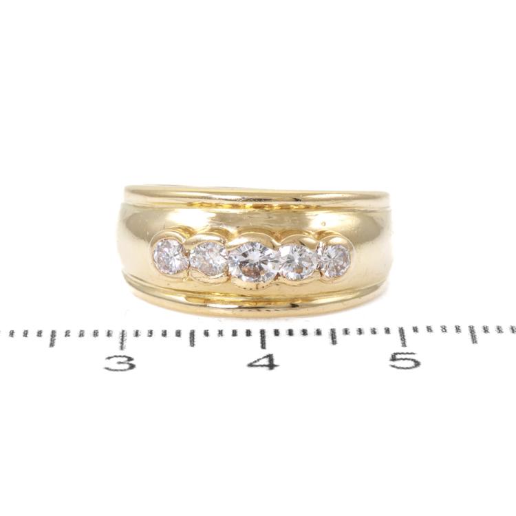Diamond dress ring set with five round Natural Diamonds totalling 0.56ct (Estimated grading: I-J SI). 18ct yellow gold. Ring size: O. Band width: 4.4mm - 5.5mm. Weight: 8.9g. (Pre-owned)