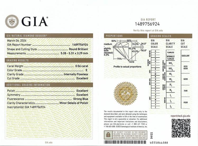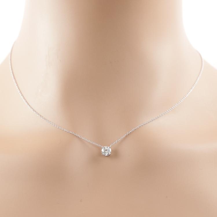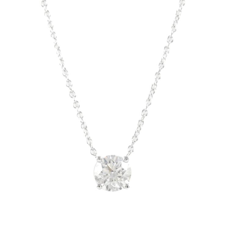 Diamond solitaire pendant with a round brilliant cut Natural Diamond of 0.56ct (with GIA Dossier Report graded as E Internally Flawless #1489756924). 18ct white gold with 18ct white gold chain attached. Length: 41cm. Weight 1.5g. (New)