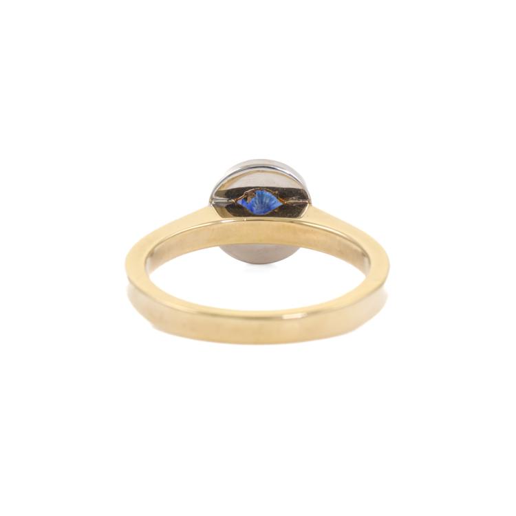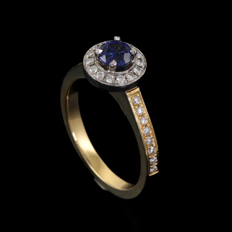 Sapphire and Diamond halo ring with a centre round blue Natural Sapphire of 0.59ct and round Natural Diamonds totalling approximately 0.30ct (Estimated grading: H-I SI). 18ct yellow & white gold. Ring size L3/4. Band width: 2.4mm. Weight: 5.4g. (As new)