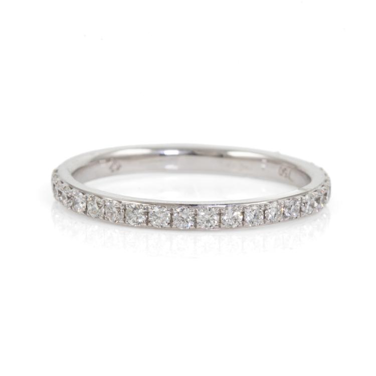 Diamond eternity ring with round Natural Diamonds totalling 0.60ct (Estimated grading: H-I SI). 18ct white gold. Ring size: O - ring resizing not recommended. Band width: 2mm. Weight: 2.2g. (As New)