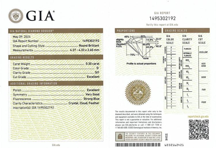 Diamond stud earrings with 2 round brilliant cut Natural Diamonds totalling 0.60ct (with GIA Summary Reports graded as D SI1 #1493397367, 1495302192. 18ct white gold. Weight: 0.8g. (New)