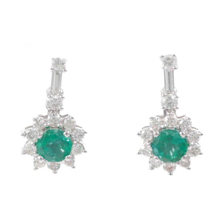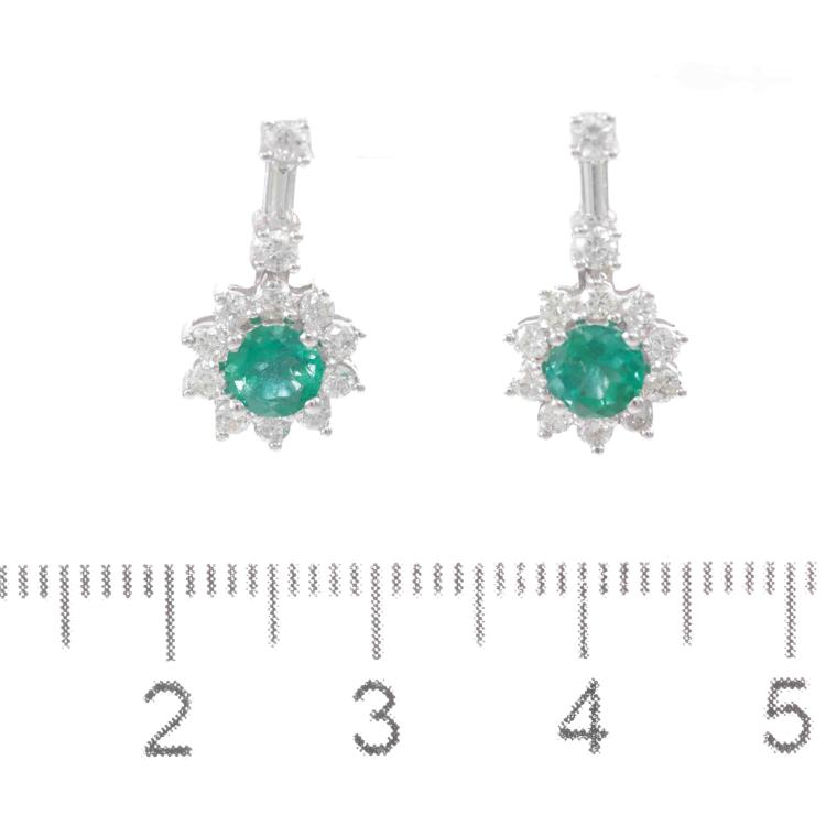 Emerald and Diamonds earrings with round Natural Emerald totalling approximately 0.60ct and round Natural Diamonds totalling approximately 0.60ct (Estimated grading: G-H SI). 18ct white gold with 10ct white gold and silicon backs. Weight: 3.4g. (Pre-owned)