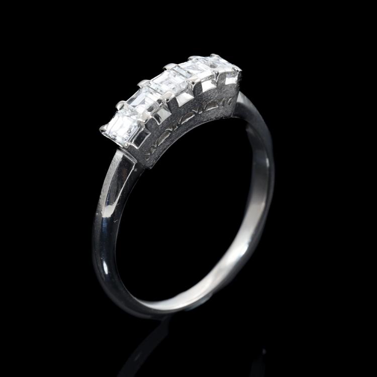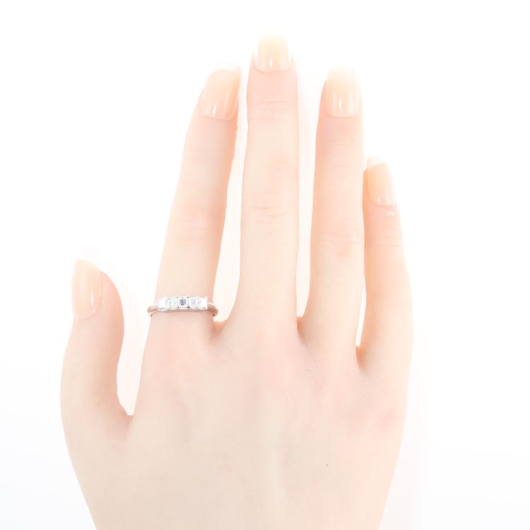 Diamond eternity ring with carre cut Natural Diamonds totalling 0.68ct (Estimated grading: G VS). Platinum - 900. Ring size: O 1/2. Band width: 1.7mm - 2.5mm. Weight: 4.0g. (Pre-owned)
