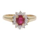 Ruby and Diamond ring with an oval shape natural Ruby of approximately 0.70ct and surrounding round natural Diamonds totalling approximately 0.36ct (Estimated grading: H-I SI). 18ct yellow and white gold. Ring size N1/2. Band width: 2.2mm - 3.2mm. Weight: 4.3g. (Pre-owned)