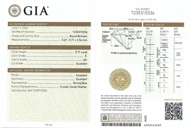 Diamond solitaire pendant with a round brilliant cut Natural Diamond of 0.71ct (with GIA Summary Report graded as E SI1 #7235315336