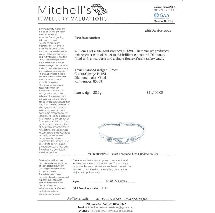 Diamond bracelet with round Natural Diamonds totalling 0.75ct (Estimated grading: H-I SI). 18ct white gold. Inner circumference: 17.0cm. Weight: 28.1g. With Certificate #419281 (Pre-owned)