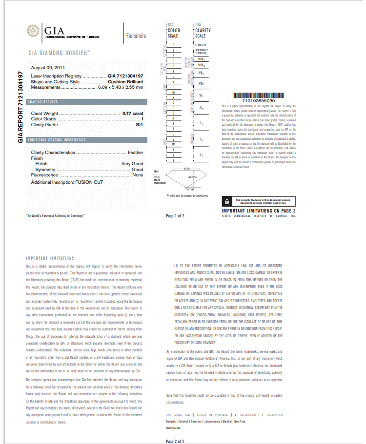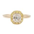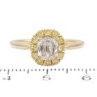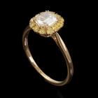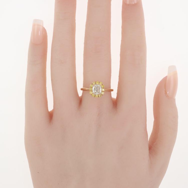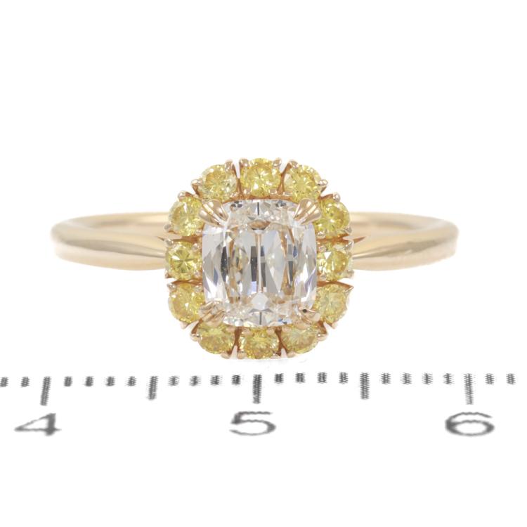 Diamond ring with centre cushion cut Natural Diamond of 0.77ct (With copy of GIA Report # 7121304197 graded as I SI1) and surrounding round Natural Diamonds totalling 0.34ct (Estimated grading: Fancy Yellow SI). 18ct yellow gold. Ring size N. Band width 1.4mm-1.8mm. Weight: 3.0g. (Pre-owned)