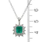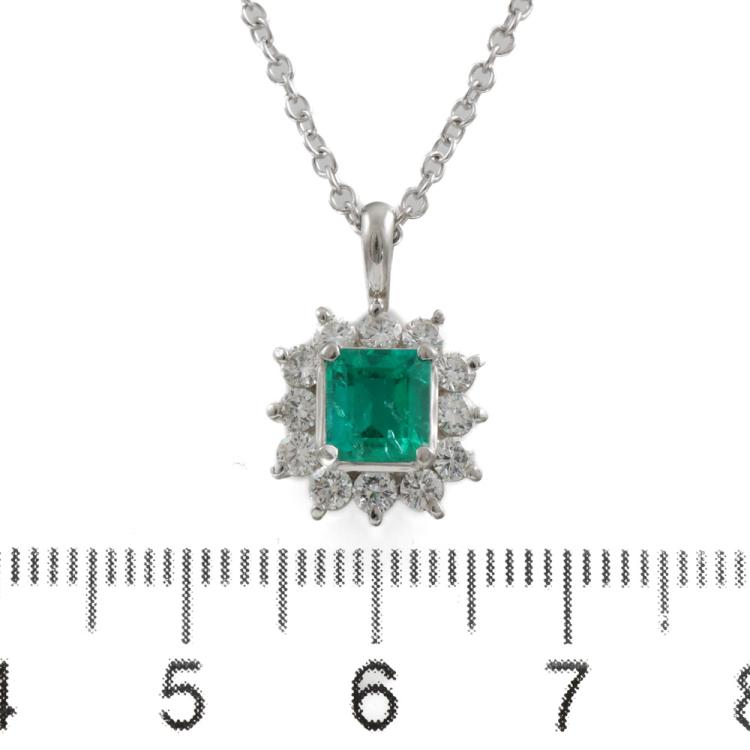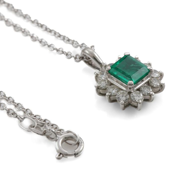 Emerald and Diamond pendant with emerald cut Natural Emerald of 0.78ct and round Natural Diamonds totalling 0.53ct (Estimated grading: G-H SI). Platinum - 900 with 45cm 18ct white gold chain. Weight: 5.3g. (Pre-owned)