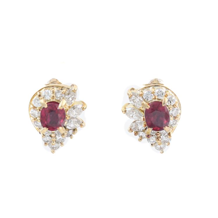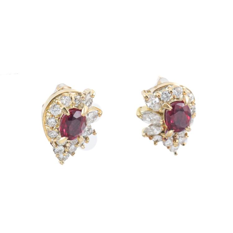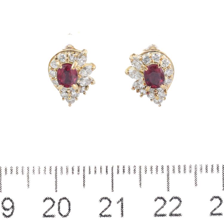 Ruby and Diamond earrings with oval shape Natural Rubies totalling 0.86ct and round Natural Diamonds totalling 0.65ct (Estimated grading: HIJ VS). Size: 11mm x 8.6mm. 18ct yellow gold. Weight: 3.6g. (Pre-owned)