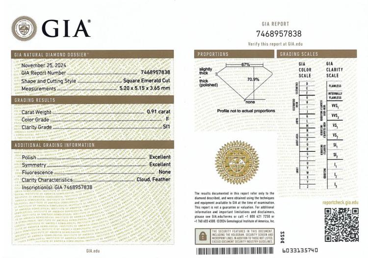 A loose square emerald cut Natural Diamond of 0.91ct (with GIA Summary Report graded as F SI1 #7468957838). (New)