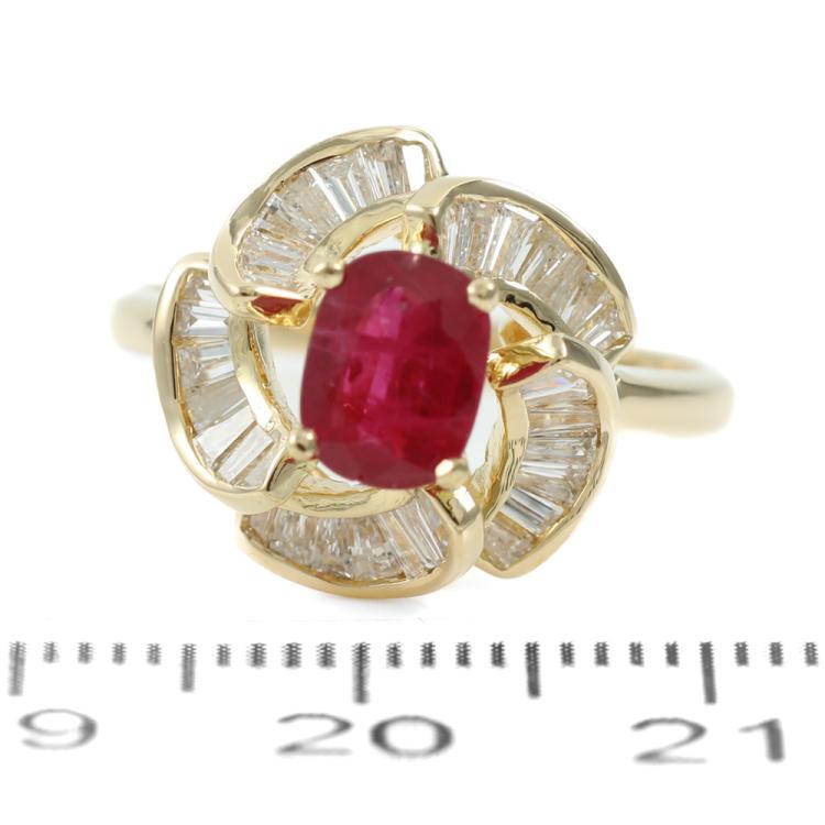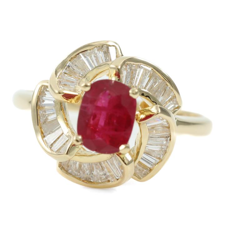 Ruby and Diamond ring with centre oval Natural Ruby of 0.95ct and surrounded by round Natural Diamonds totalling 1.05ct (Estimated grading: I-J SI-P1). 18ct yellow gold. Ring size L. Band width: 1.9mm. Weight: 4.5g. (Pre-owned)