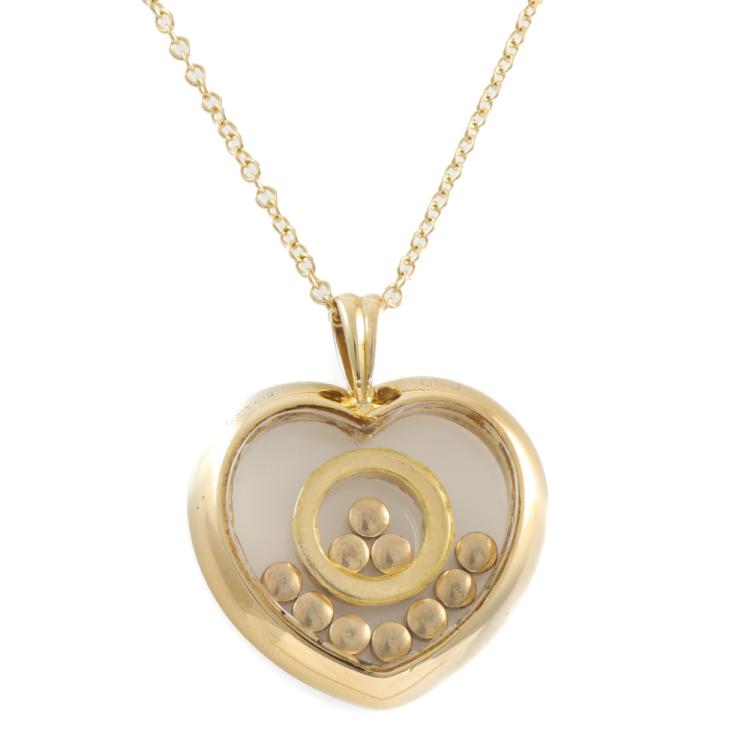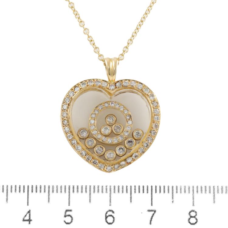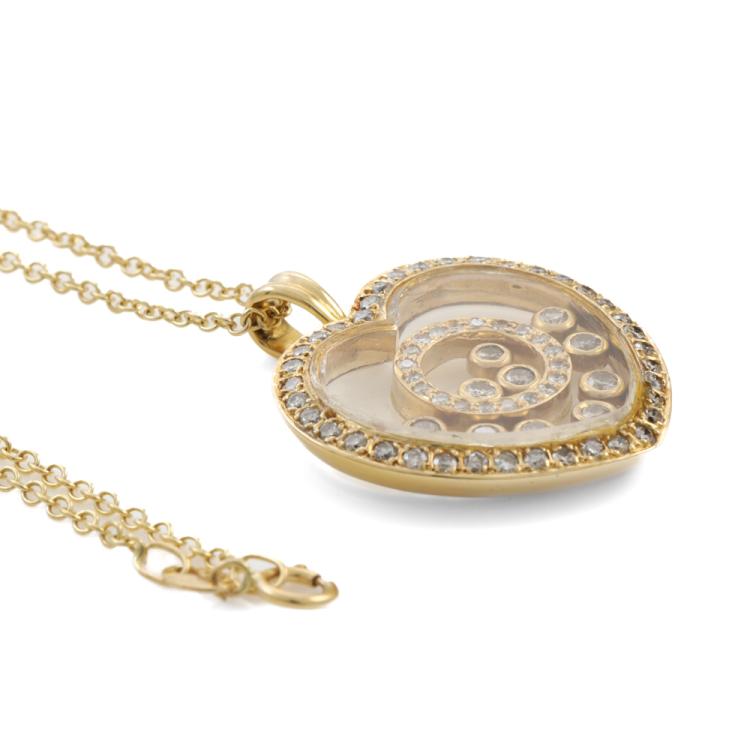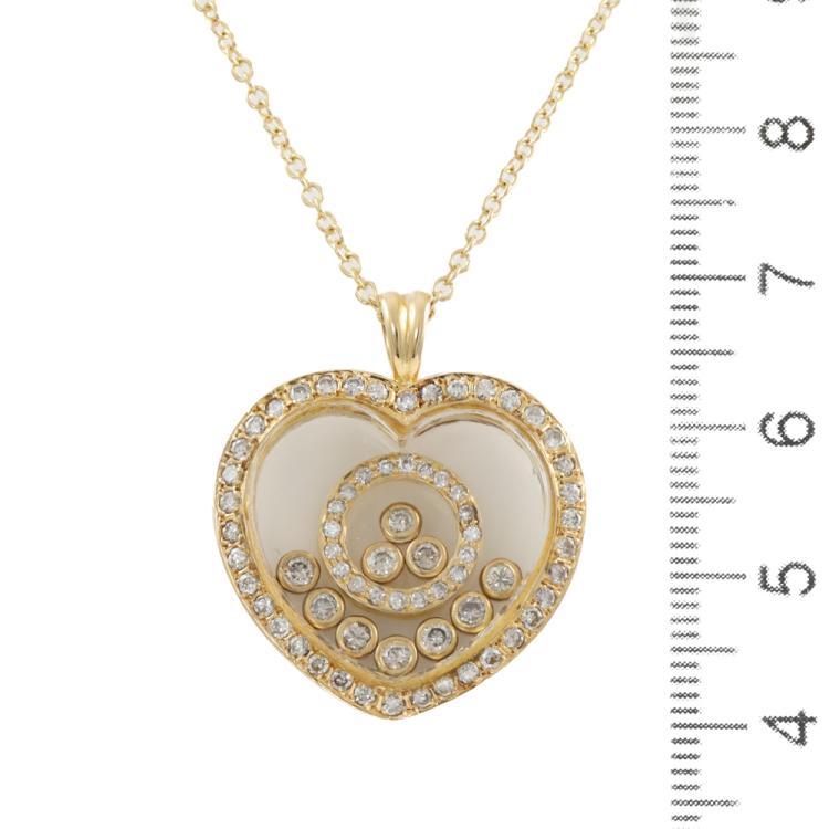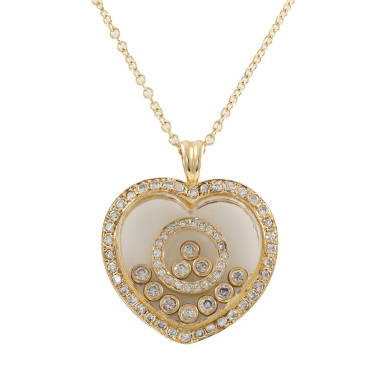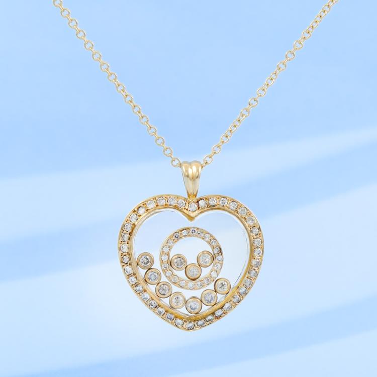 Diamond heart shaped pendant (30.0mm x 23.0mm) with round Natural Diamonds totalling 0.96ct (10 diamonds are floating beneath the glass). (Estimated grading: TTLB SI). 18ct yellow gold with 18ct yellow gold 44cm chain. Weight: 12.5g. (Pre-owned)